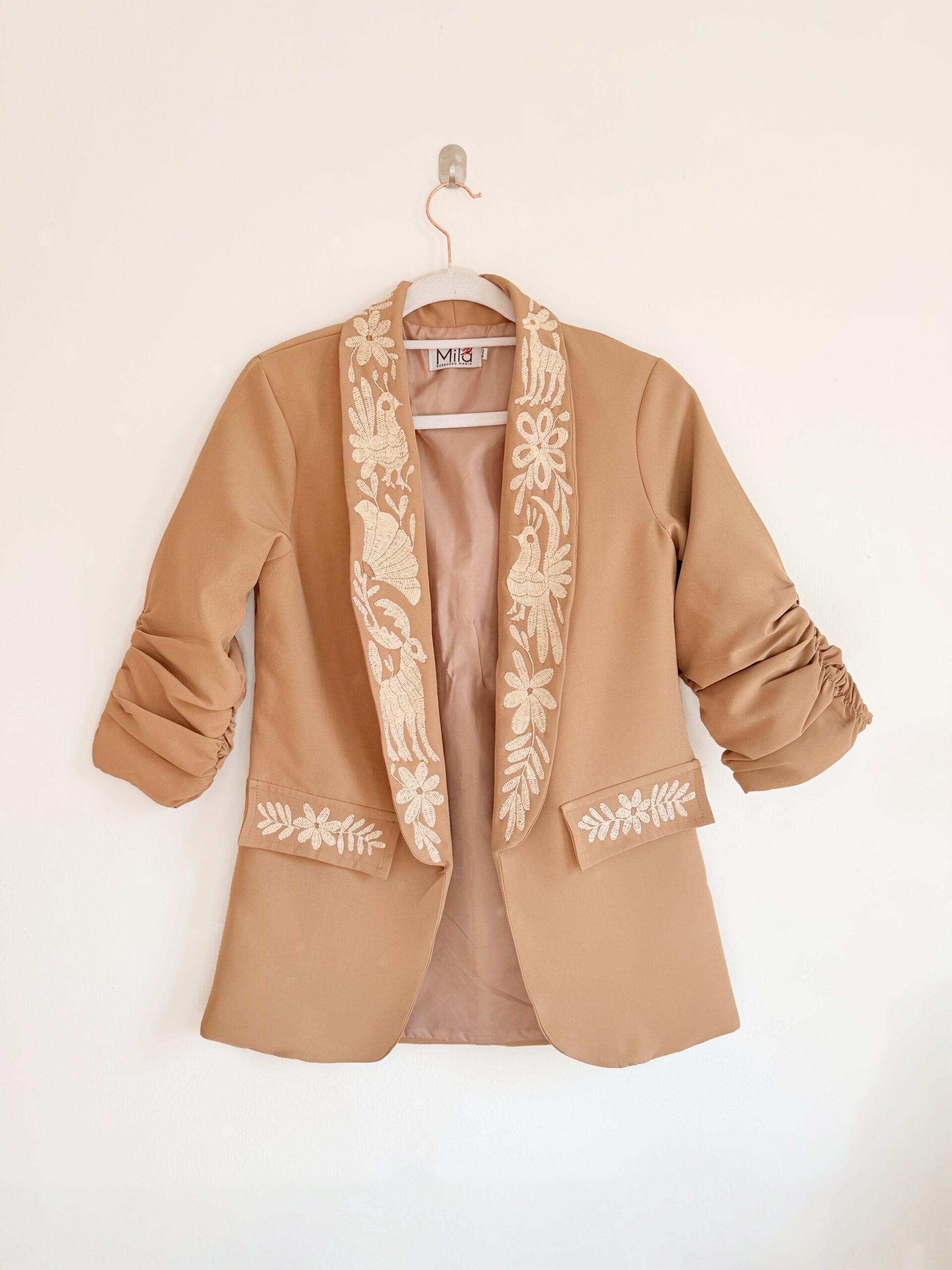 Saco talla chica, elaborado con tela Barbie color beige claro y con bordado tenango color hueso hecho a mano.