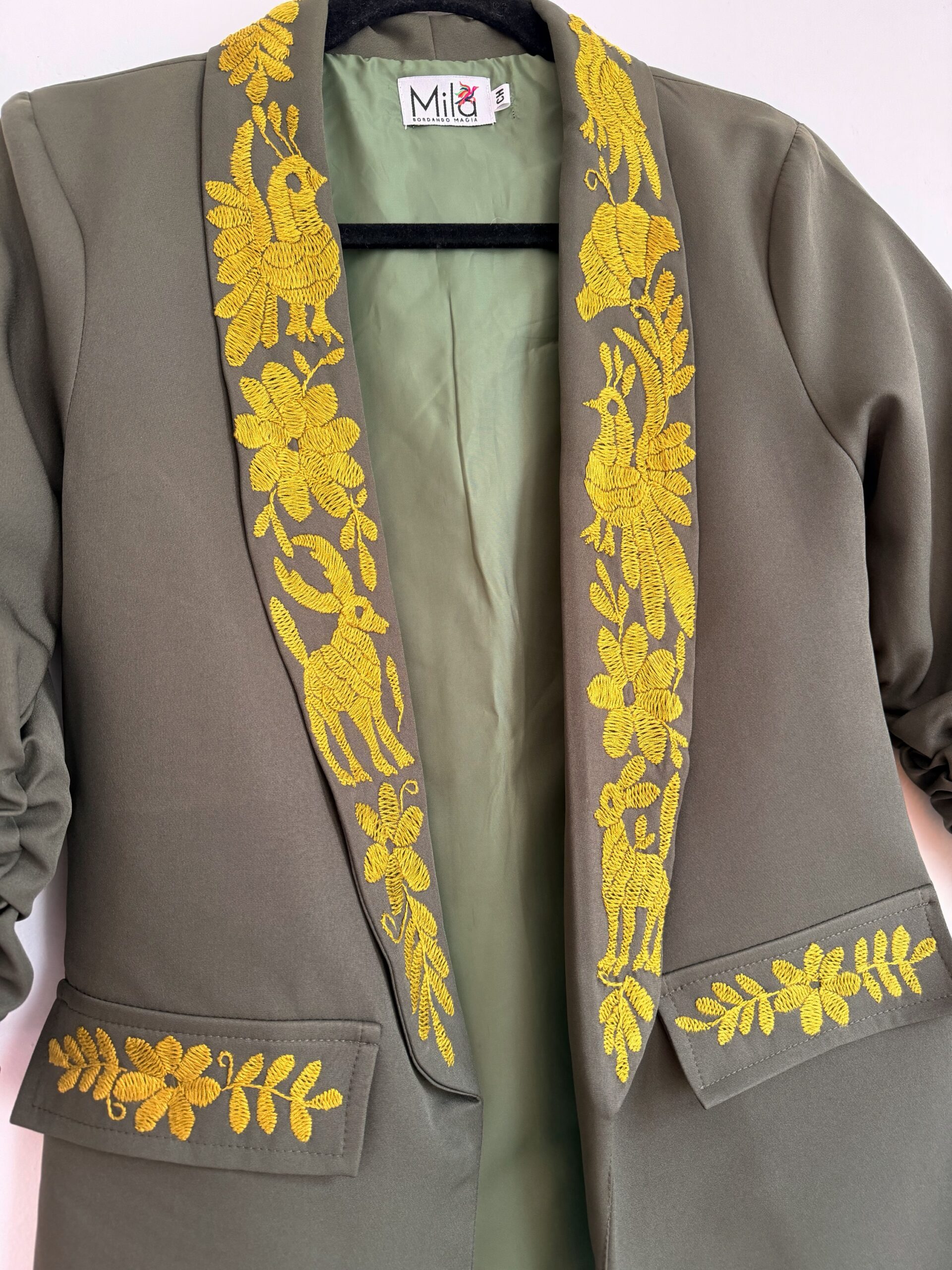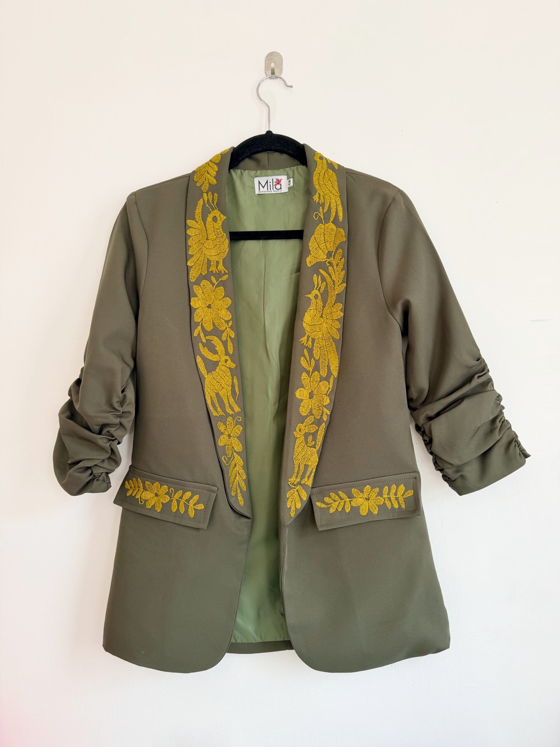 Saco talla chica elaborado con tela Barbie color olivo y con bordado tenango color verde hecho a mano.