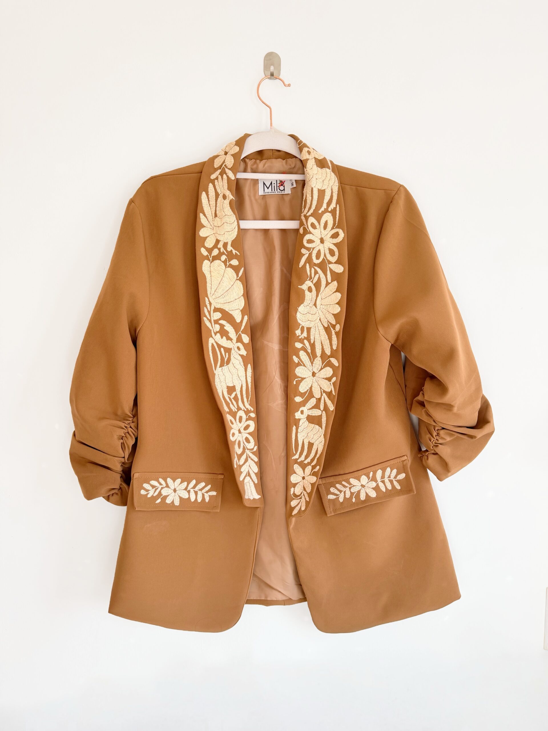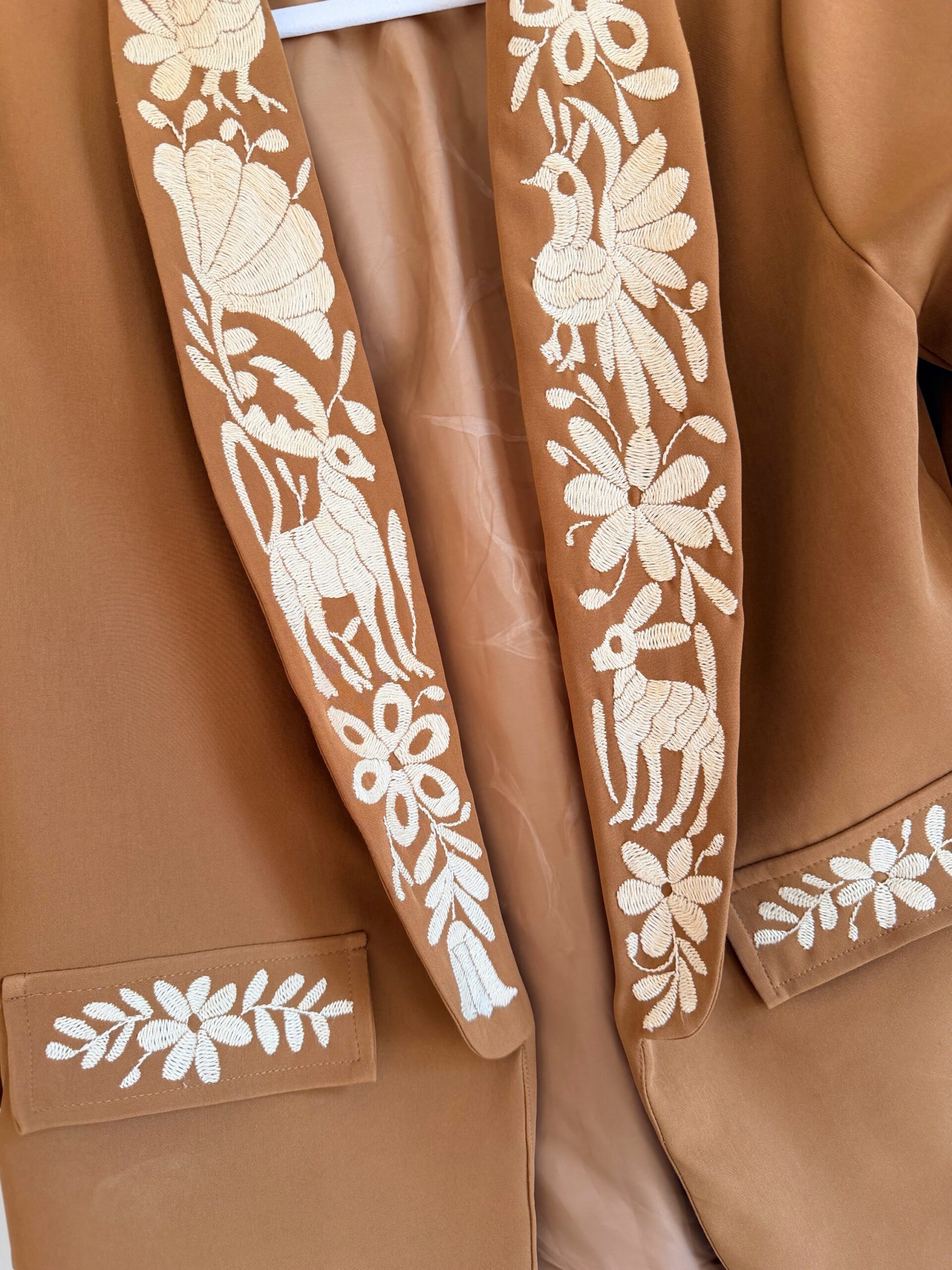 Saco talla extra grande elaborado con tela Barbie en color café claro y con bordado tenango en color hueso hecho a mano.