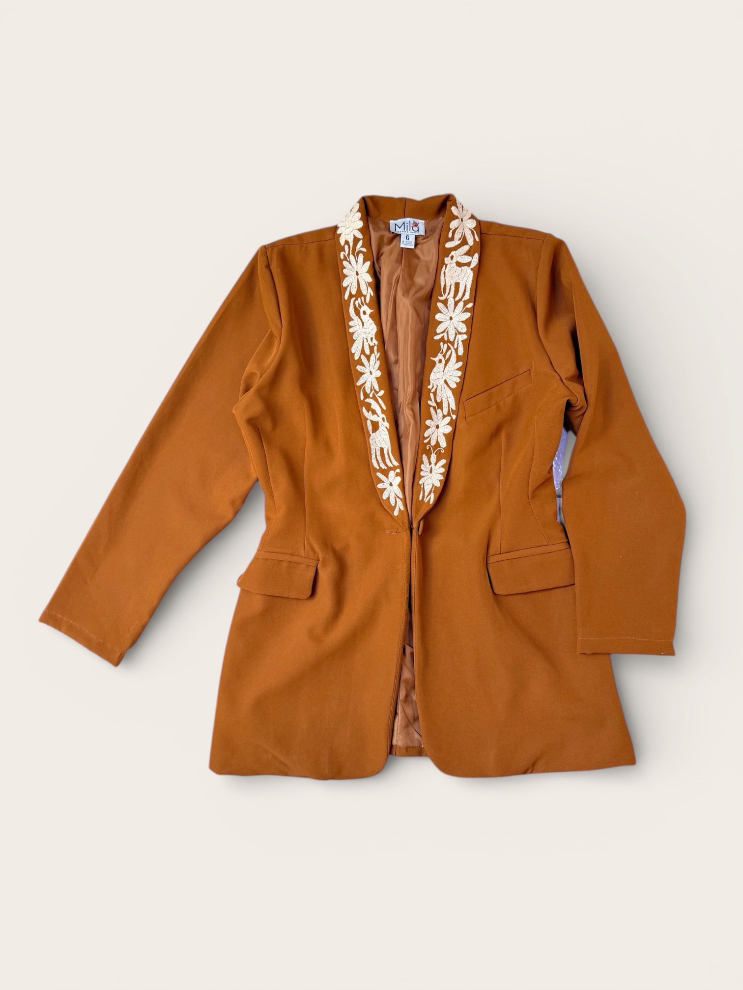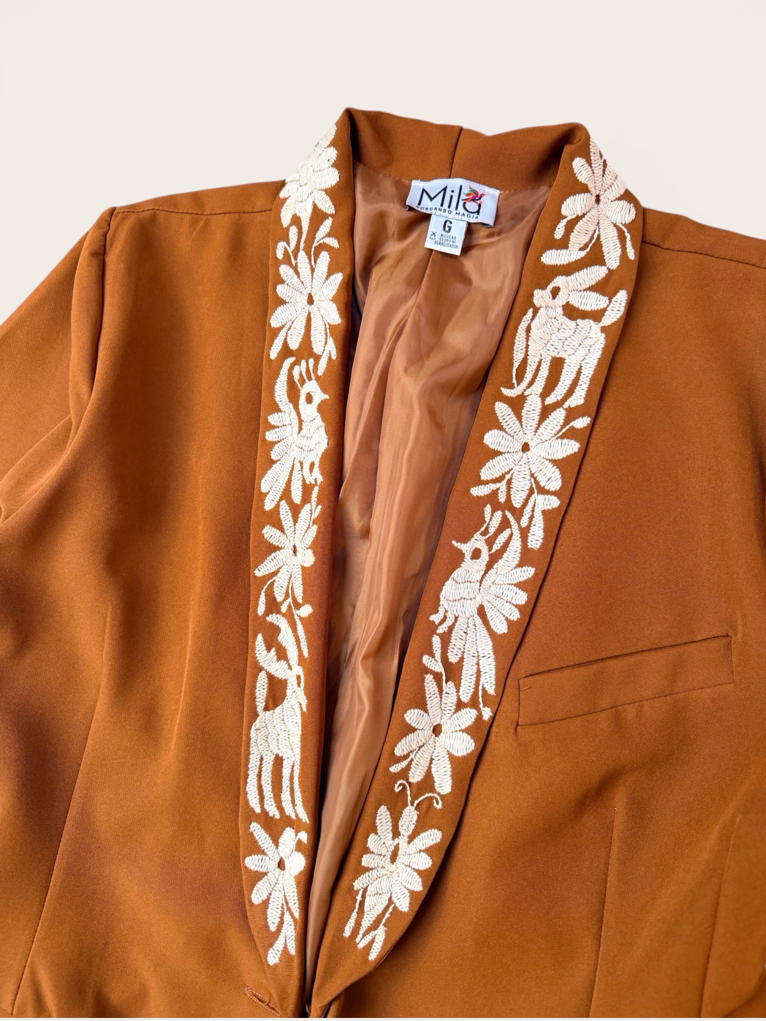 Saco talla grande elaborado con tela Barbie color café claro y con bordado tenango color hueso.