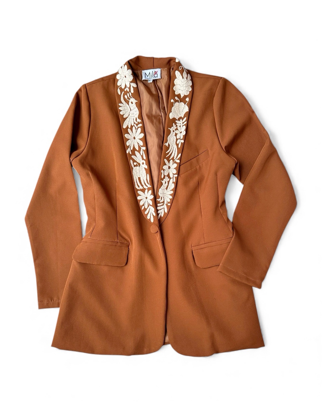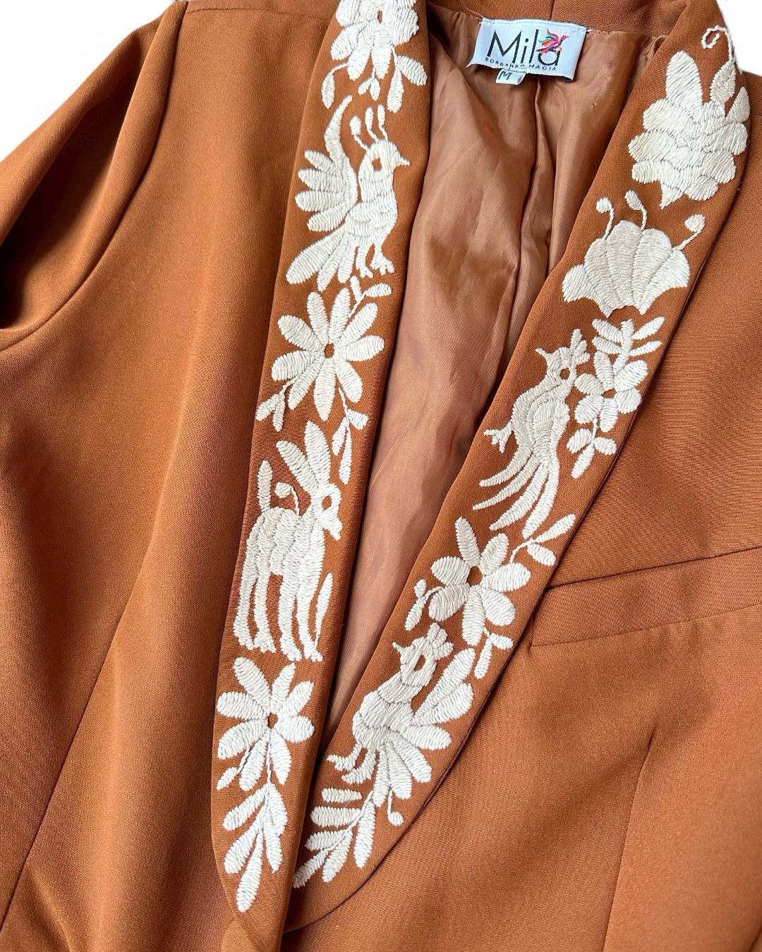 Saco talla mediana, manga larga, elaborado con tela Barbie color ladrillo y con bordado tenango hecho a mano color beige.