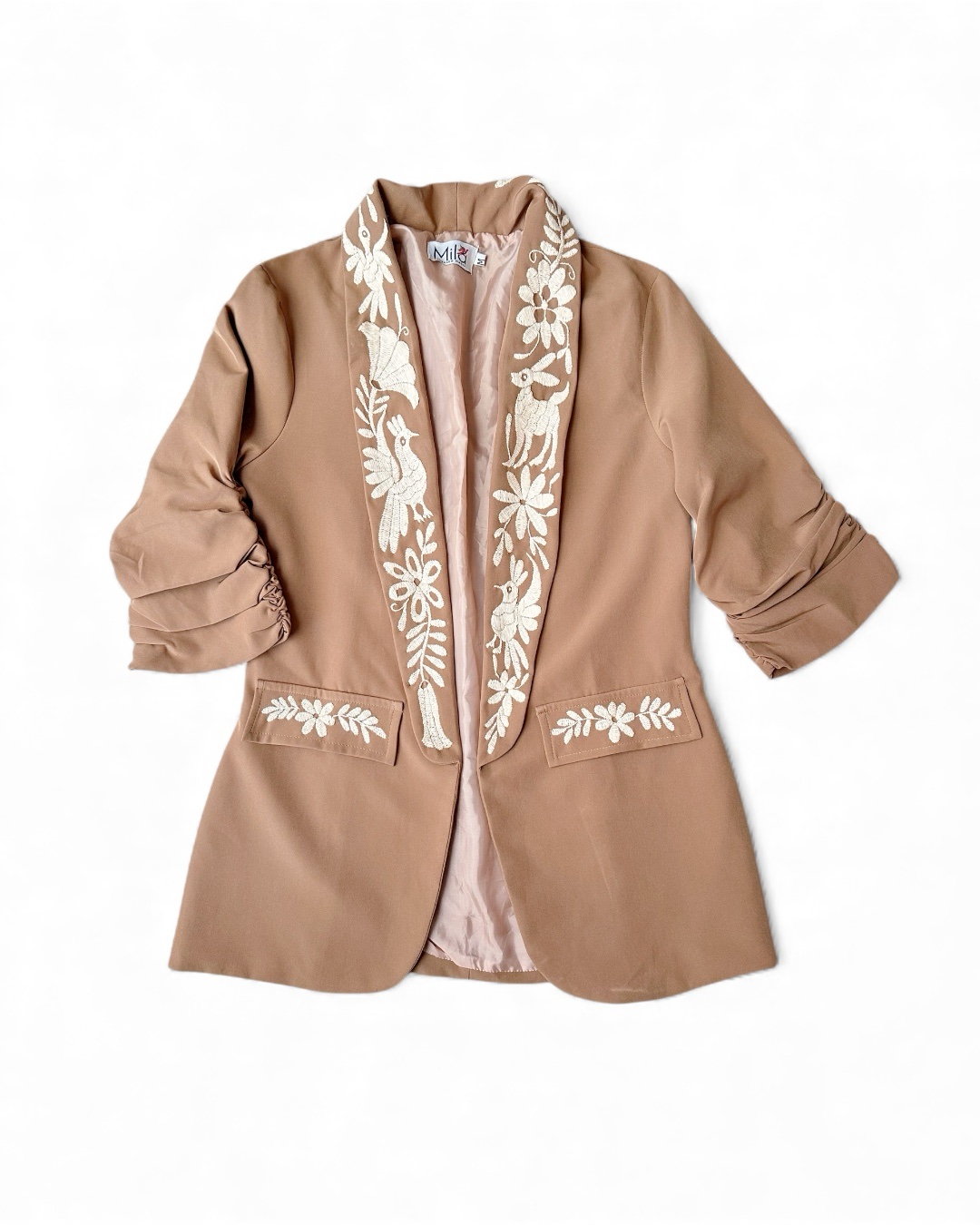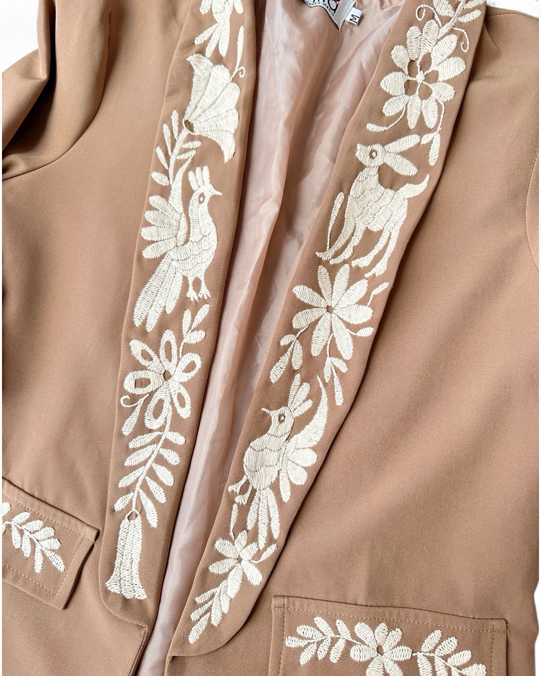 Saco talla mediana, elaborado con tela Barbie color café claro y con bordado tenango color beige.