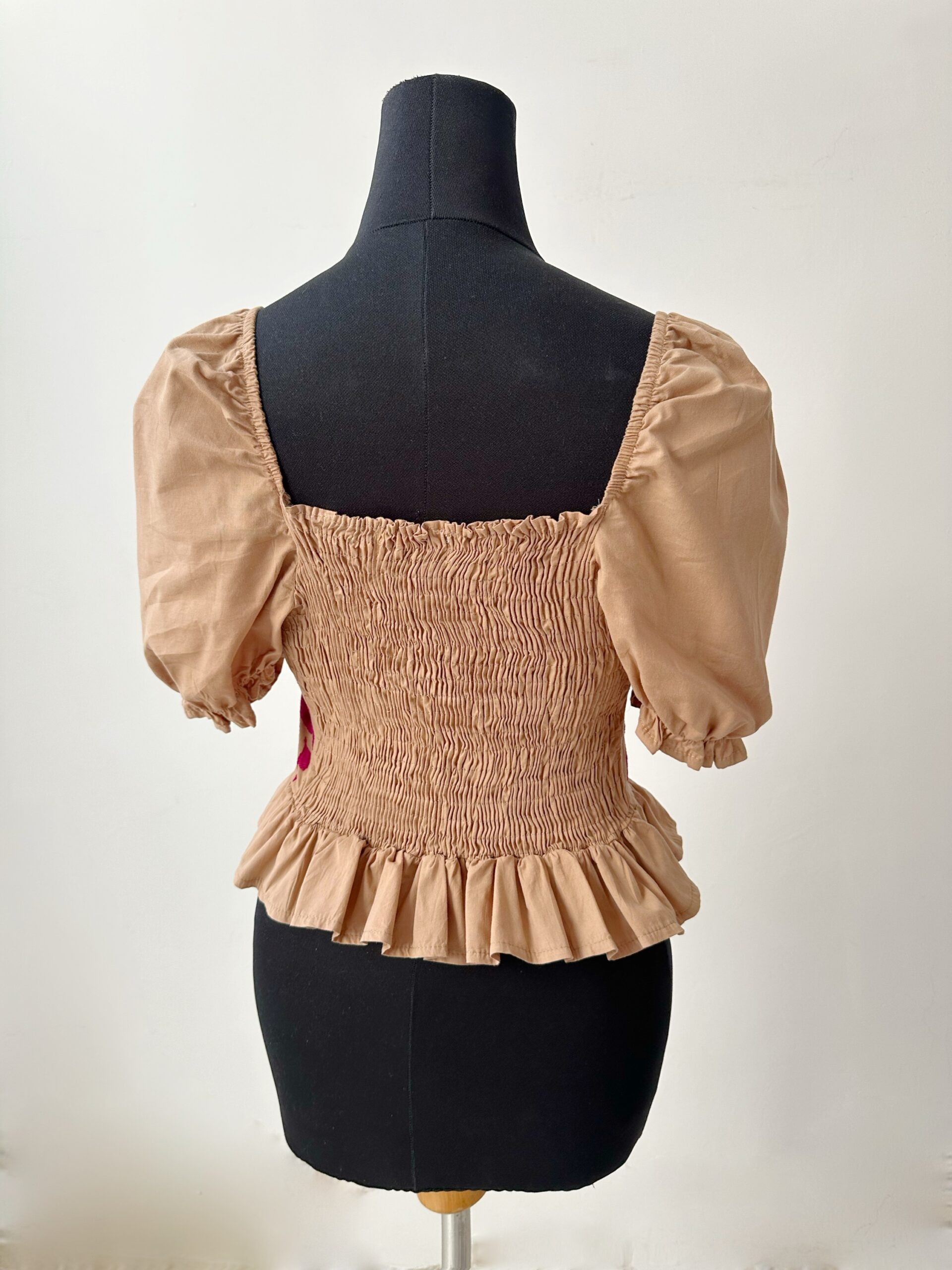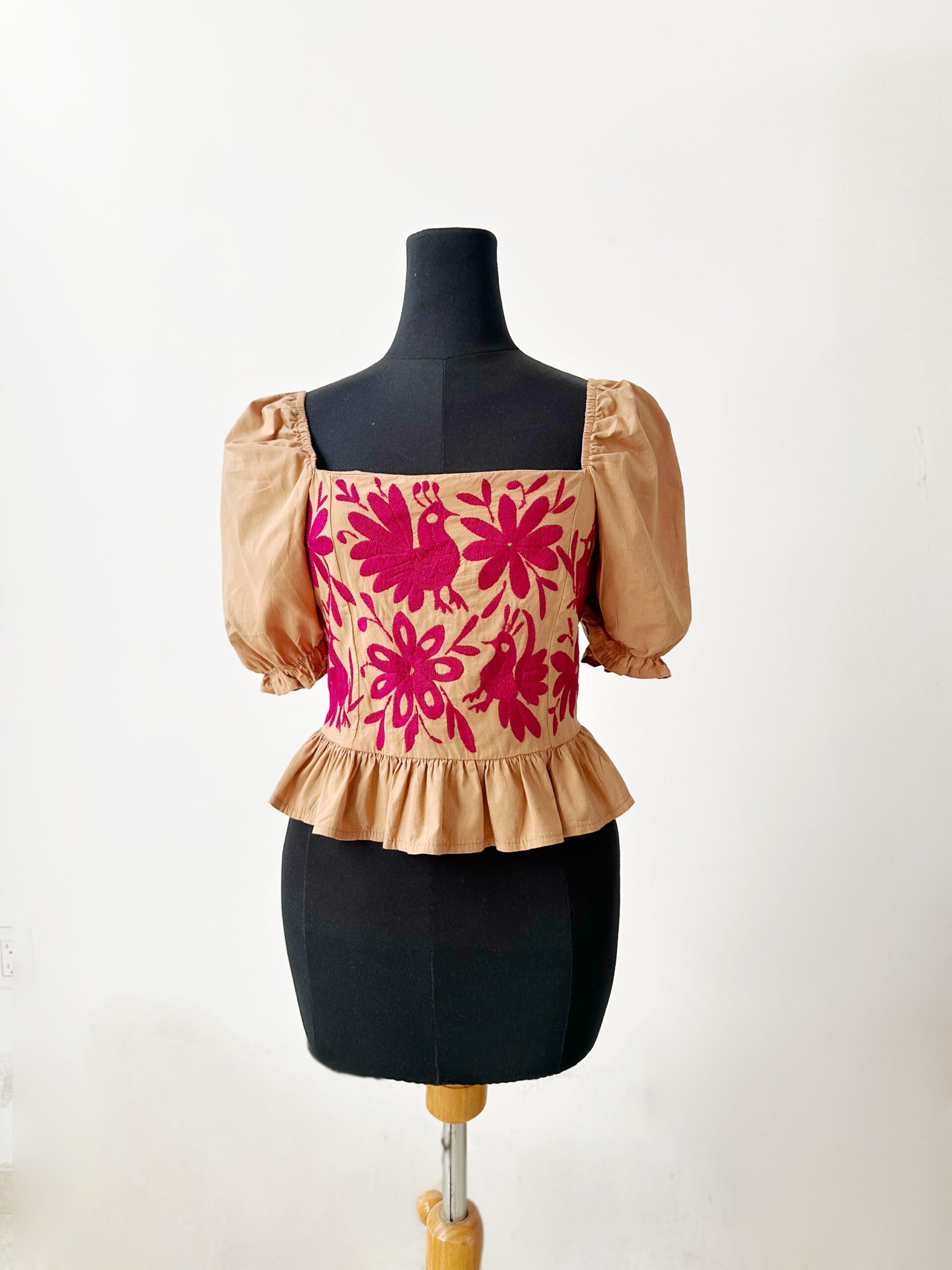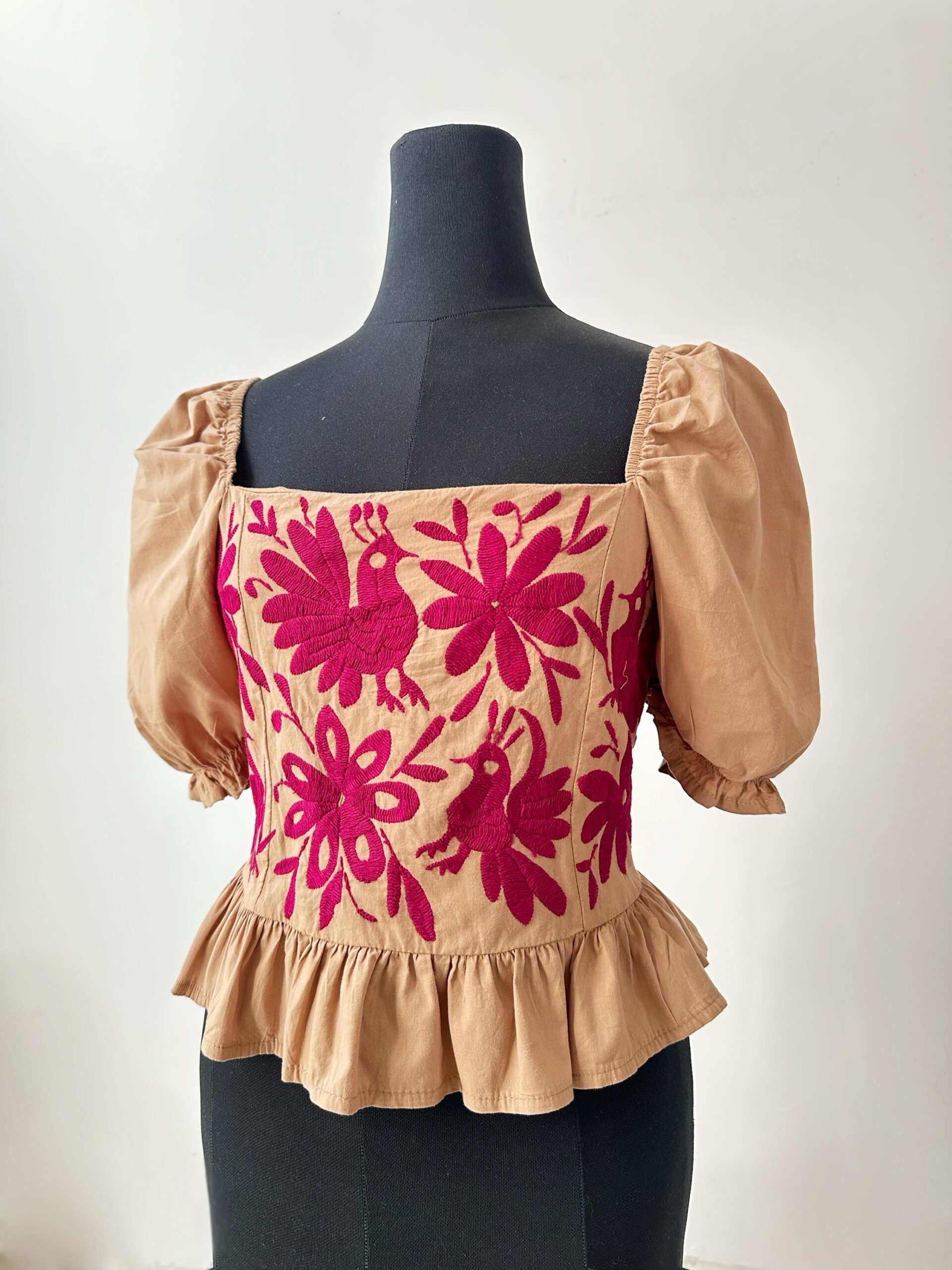 Blusa Talla mediana elaborada con tela de algodón en color café claro con bordado tenango hecho a mano en color bugambilia.