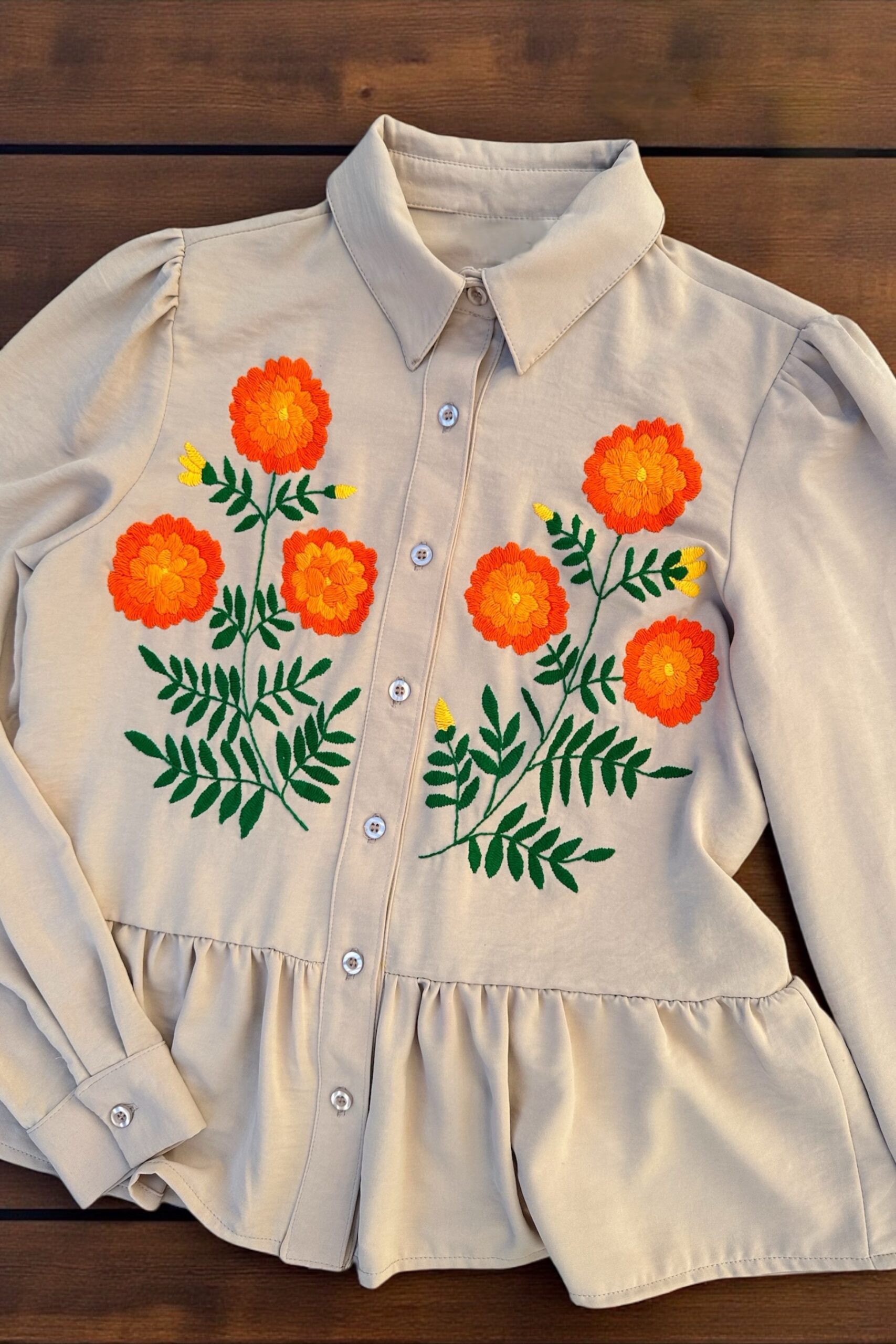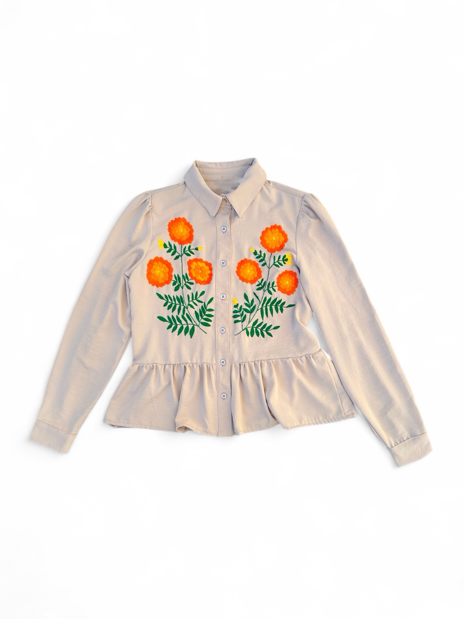 Blusa talla Chica, elaborada con tela viscosa color beige y con bordado tenango hecho a mano.