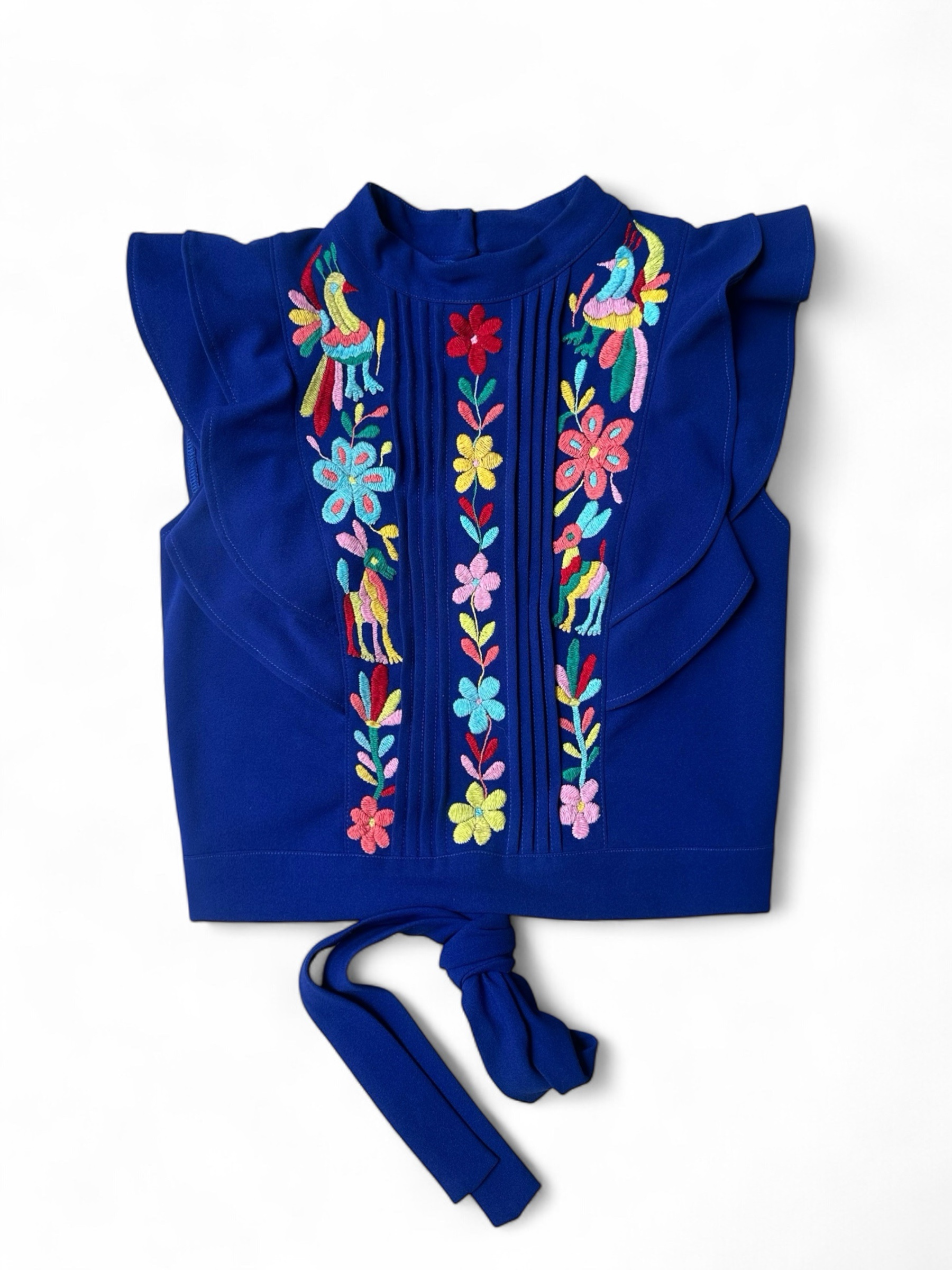 Blusa con olanes talla chica, elaborada con tela techno crepé color azul rey y con bordado tenango.