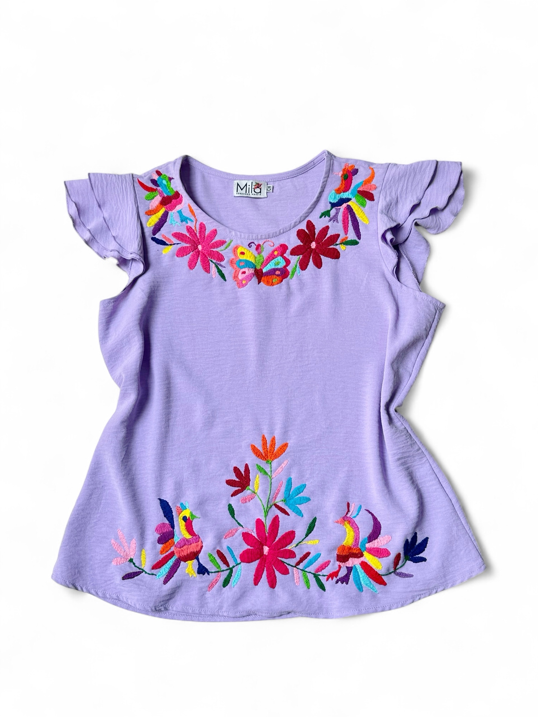Blusa talla chica, elaborada con tela cey color lila y con bordado tenango multicolor.