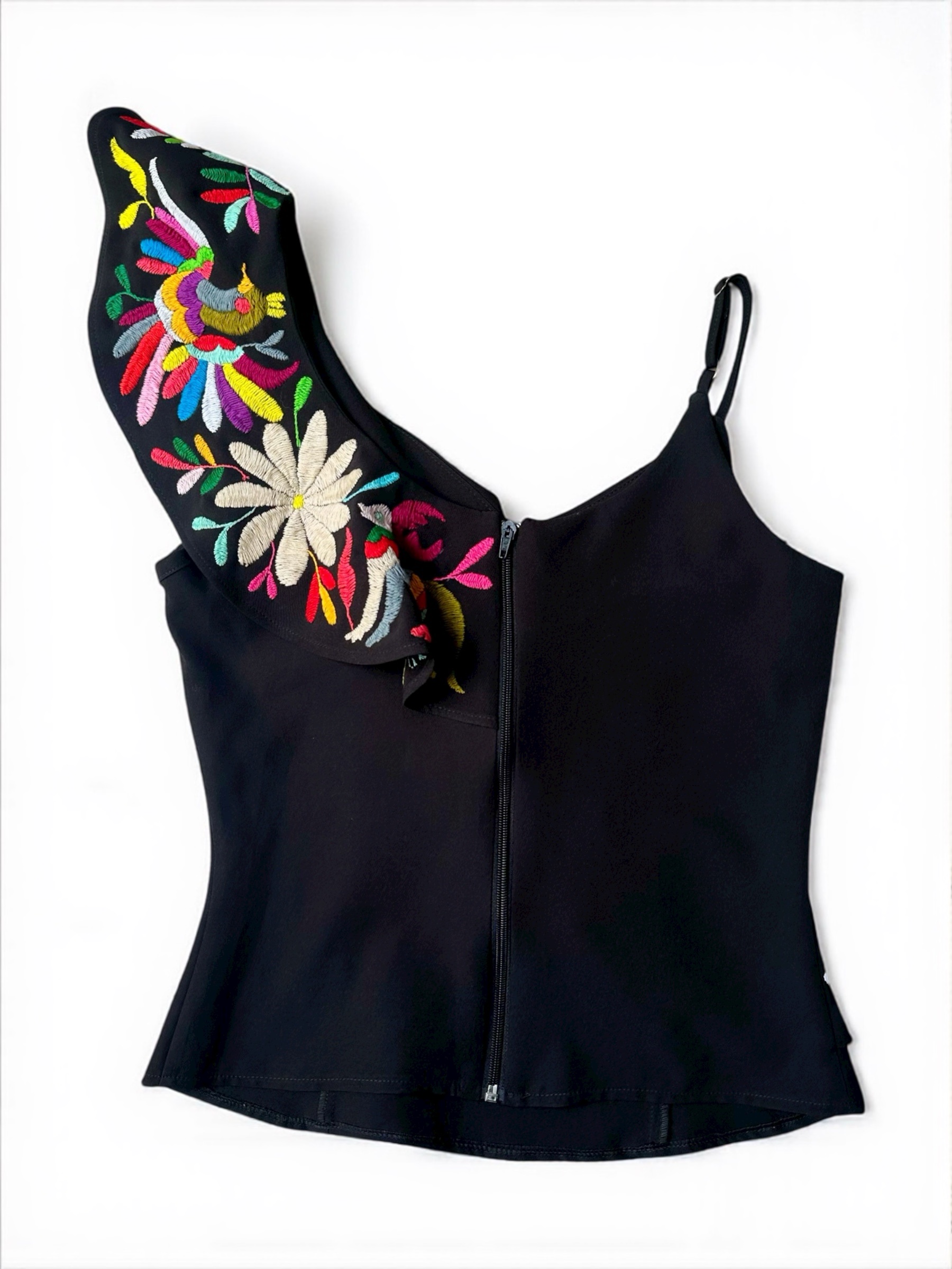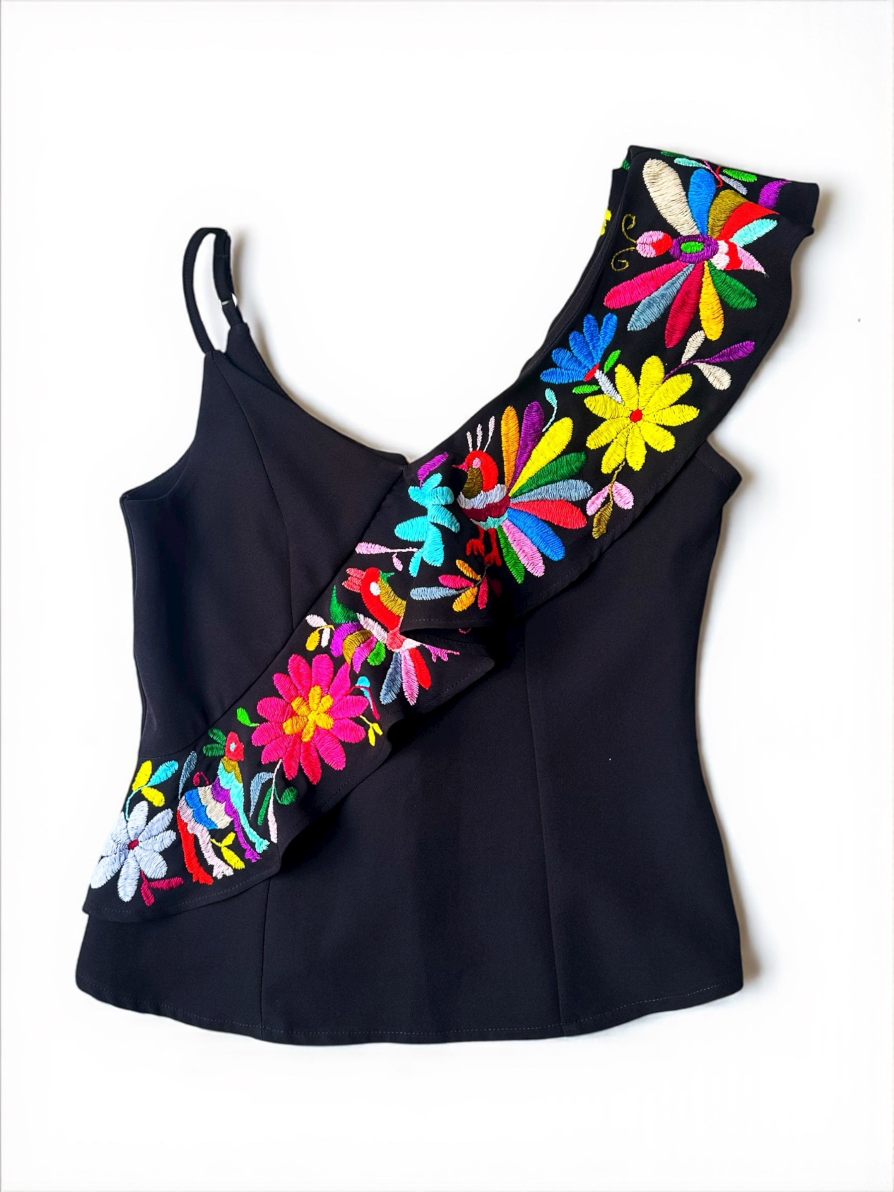 Blusa talla chica, color negro elaborada con tela crepé y con bordado tenango multicolor.