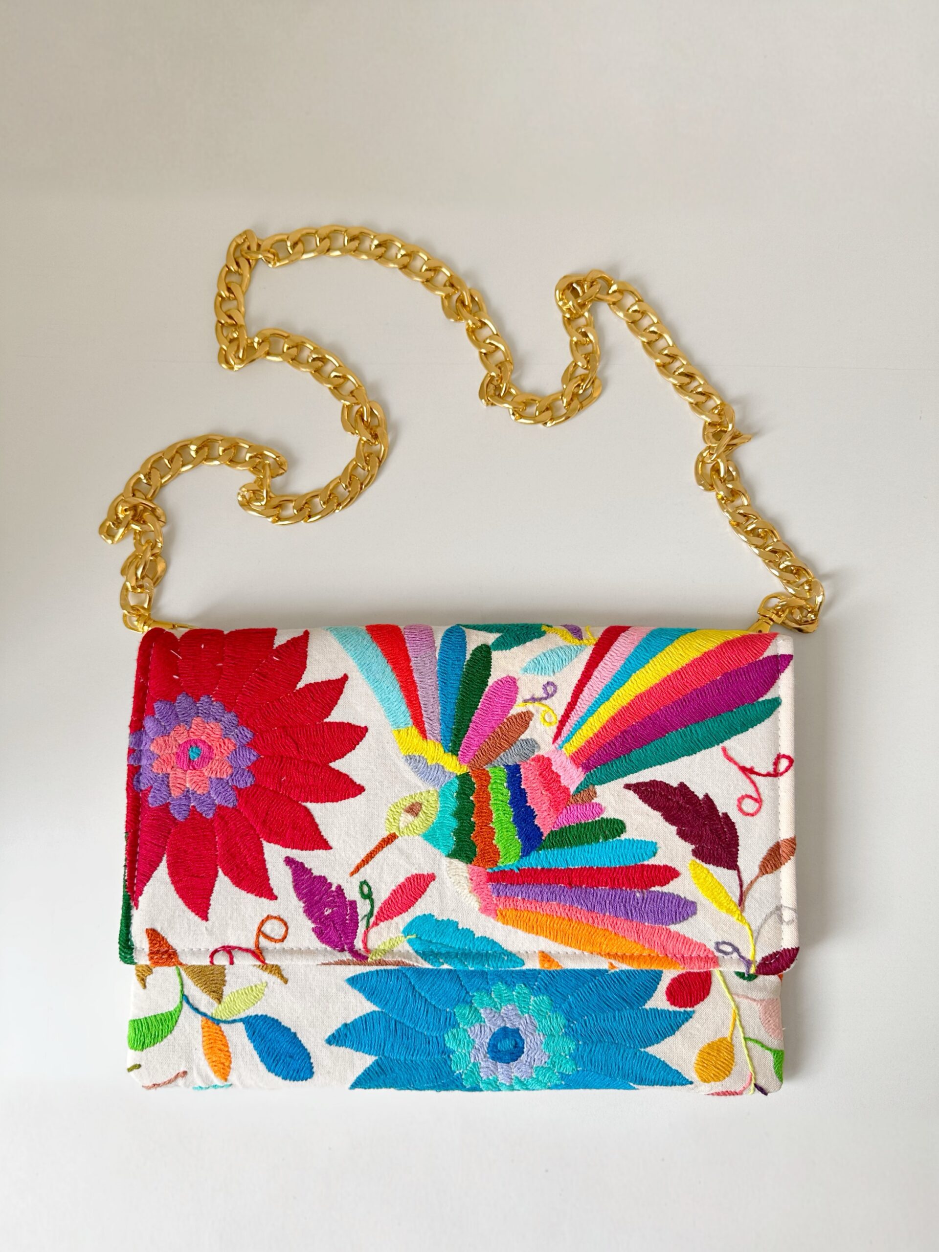 Bolsa clutch elaborada con manta prelavada de algodón y con bordado tenango multicolor. Lleva forro de loneta de algodón y relleno bandeado.