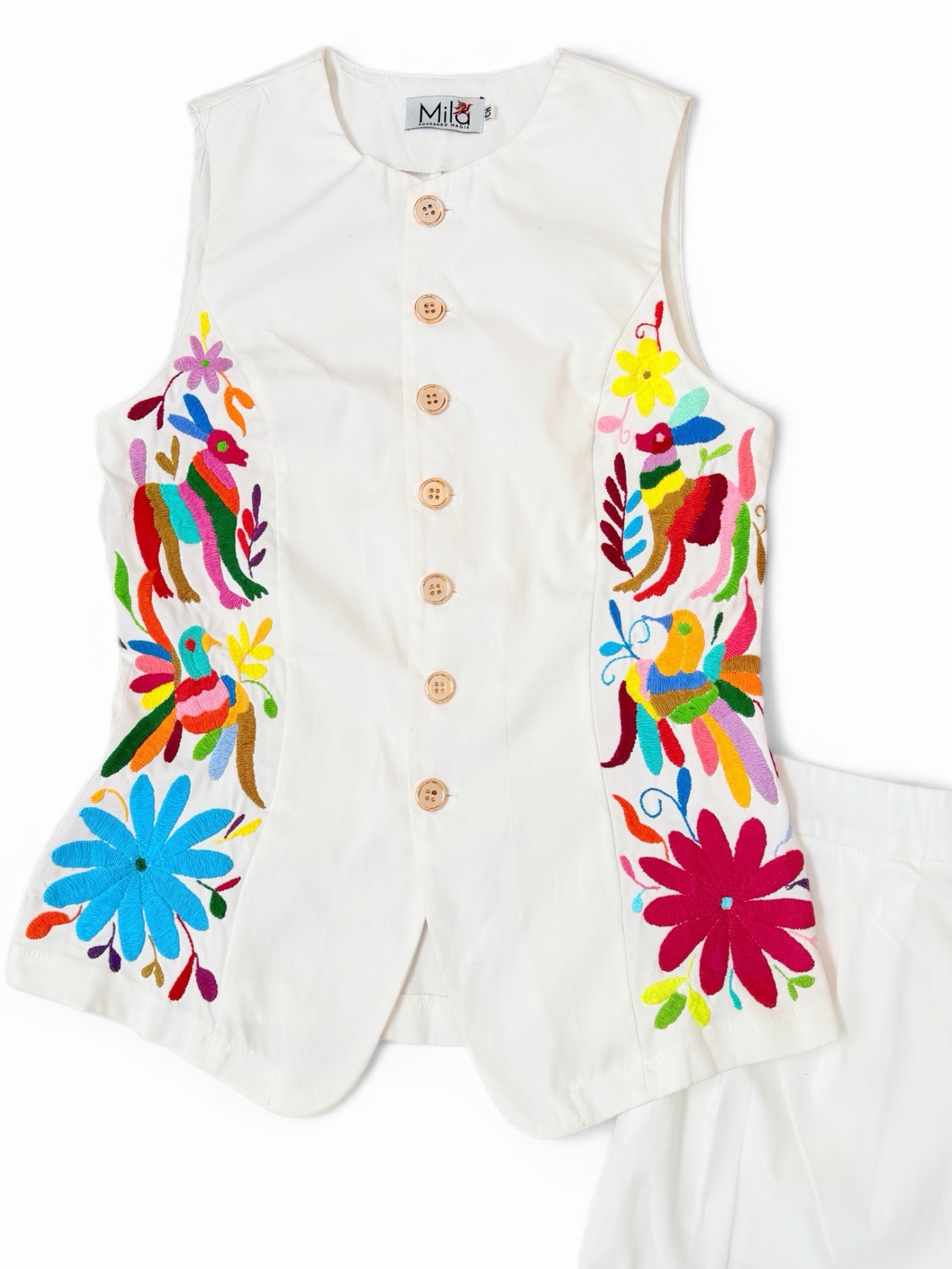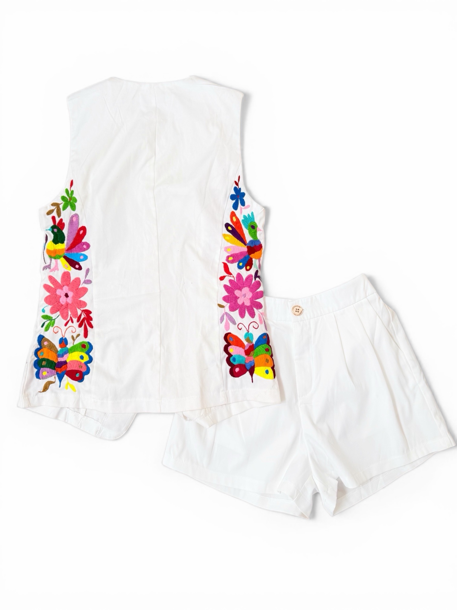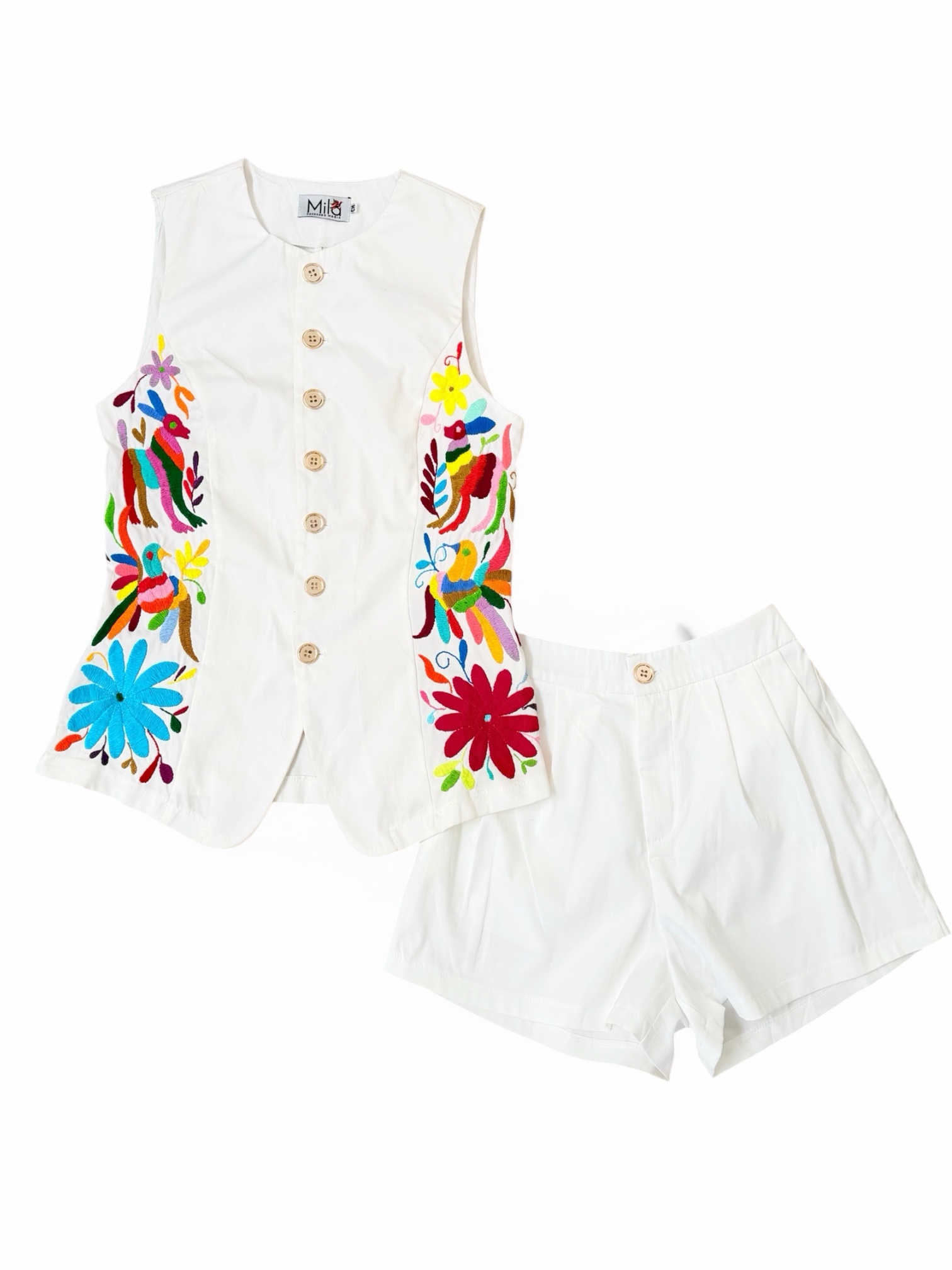 Conjunto de chaleco y short color blanco talla chica elaborado con tela de algodón y con bordado tenango multicolor hecho a mano.