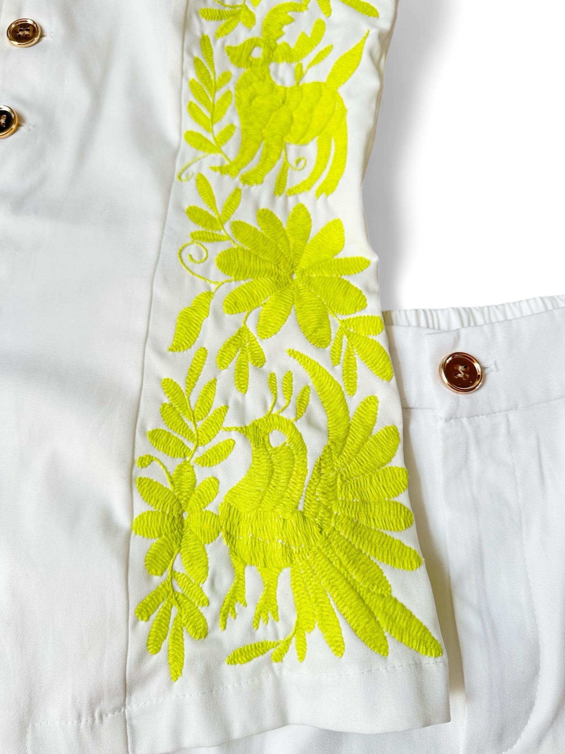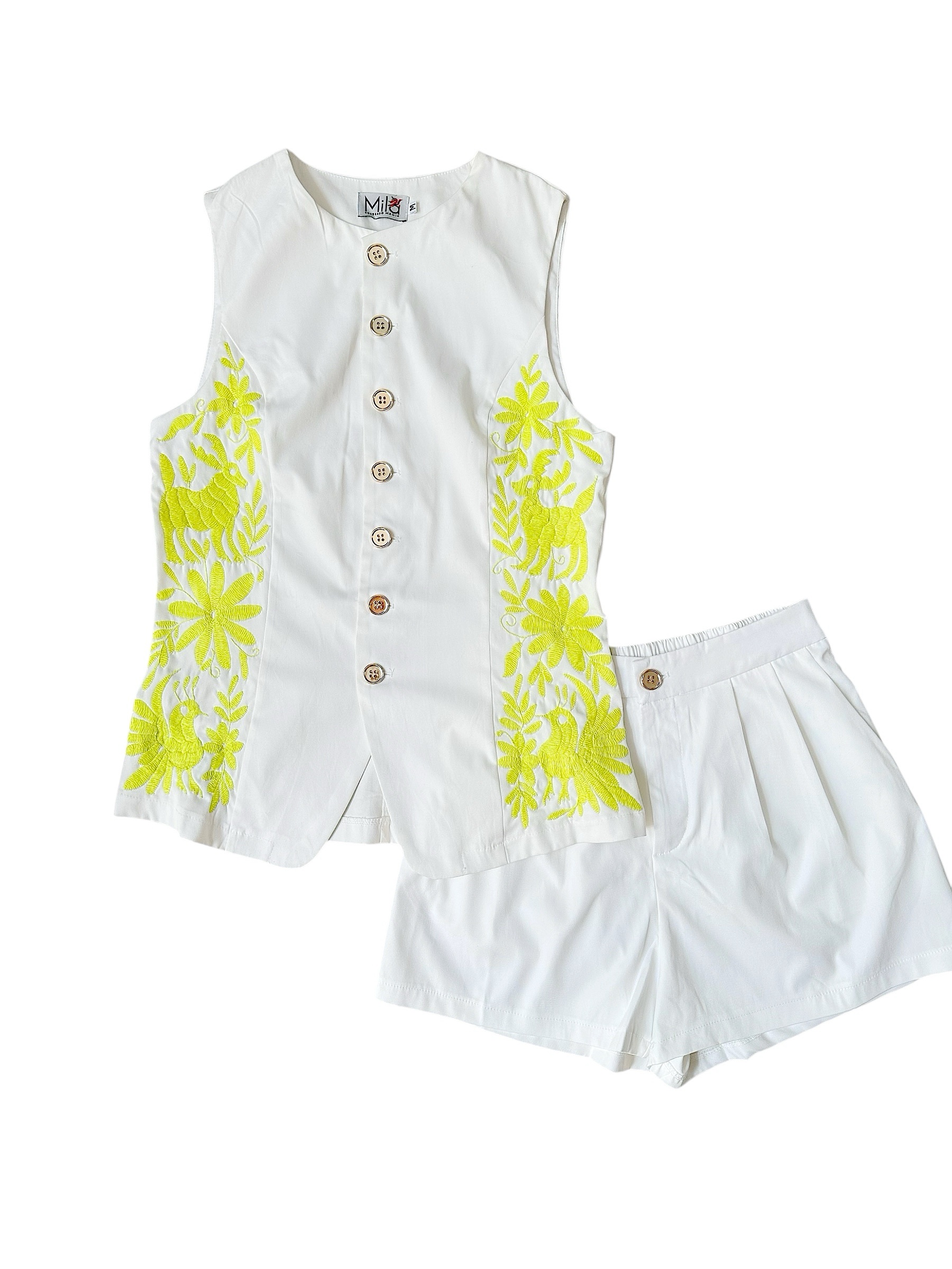 Conjunto de chaleco y short color blanco talla mediana, elaborado con tela de algodón y con bordado tenango color verde lima.