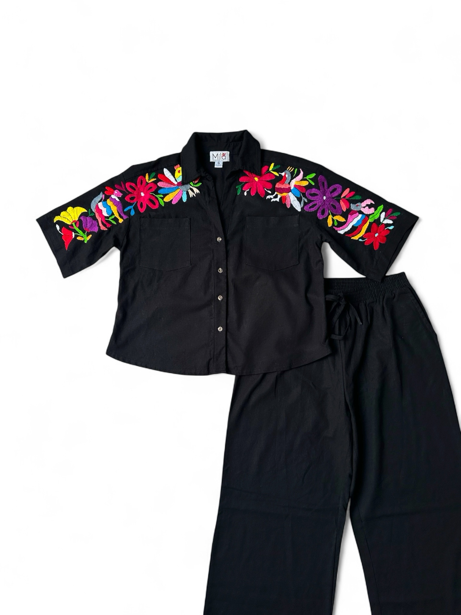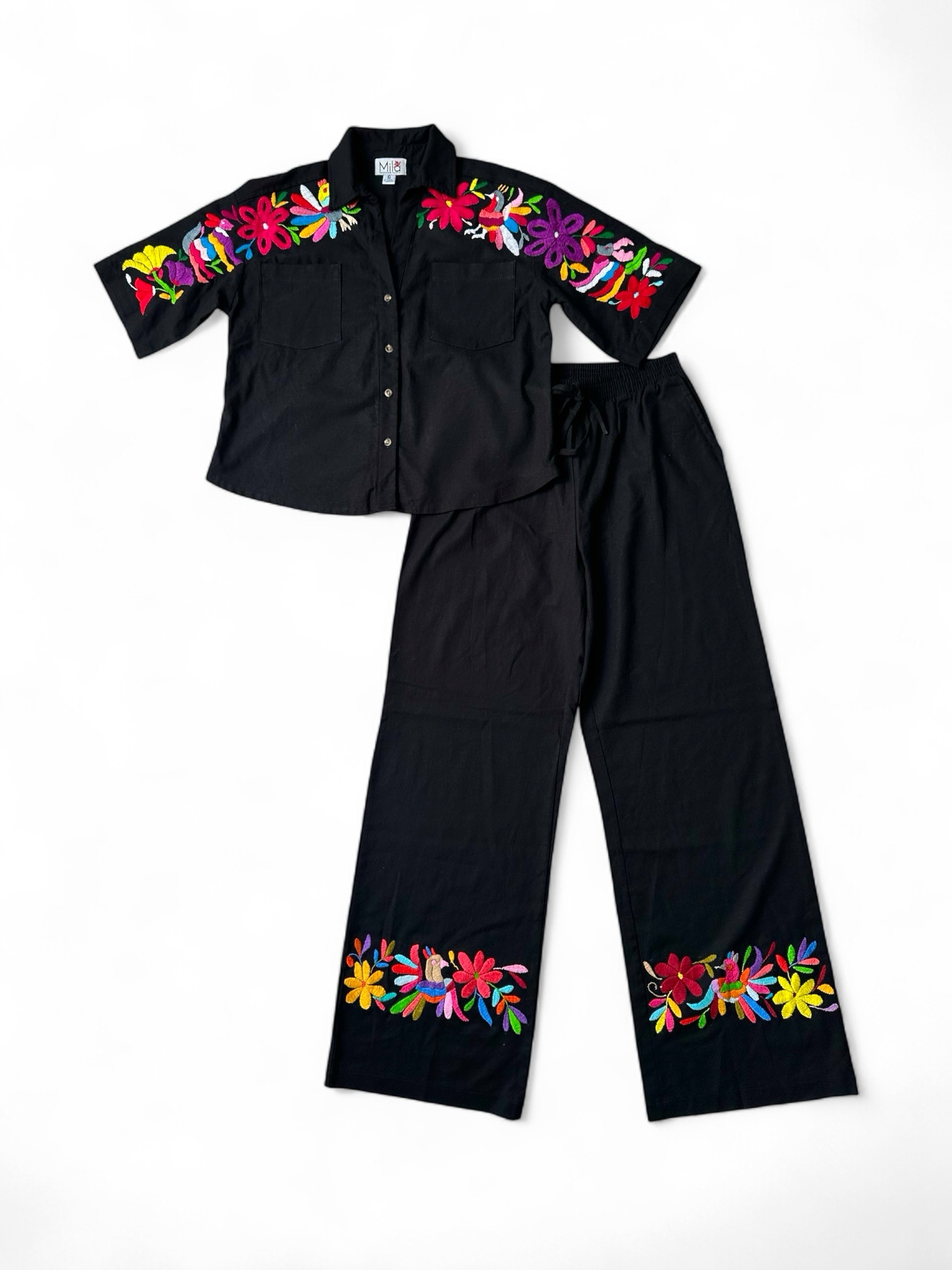 Conjunto de blusa y pantalón, talla grande, elaborado de lino color negro y con bordado tenango multicolor.