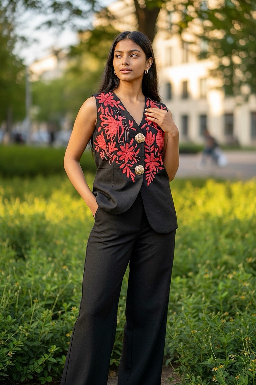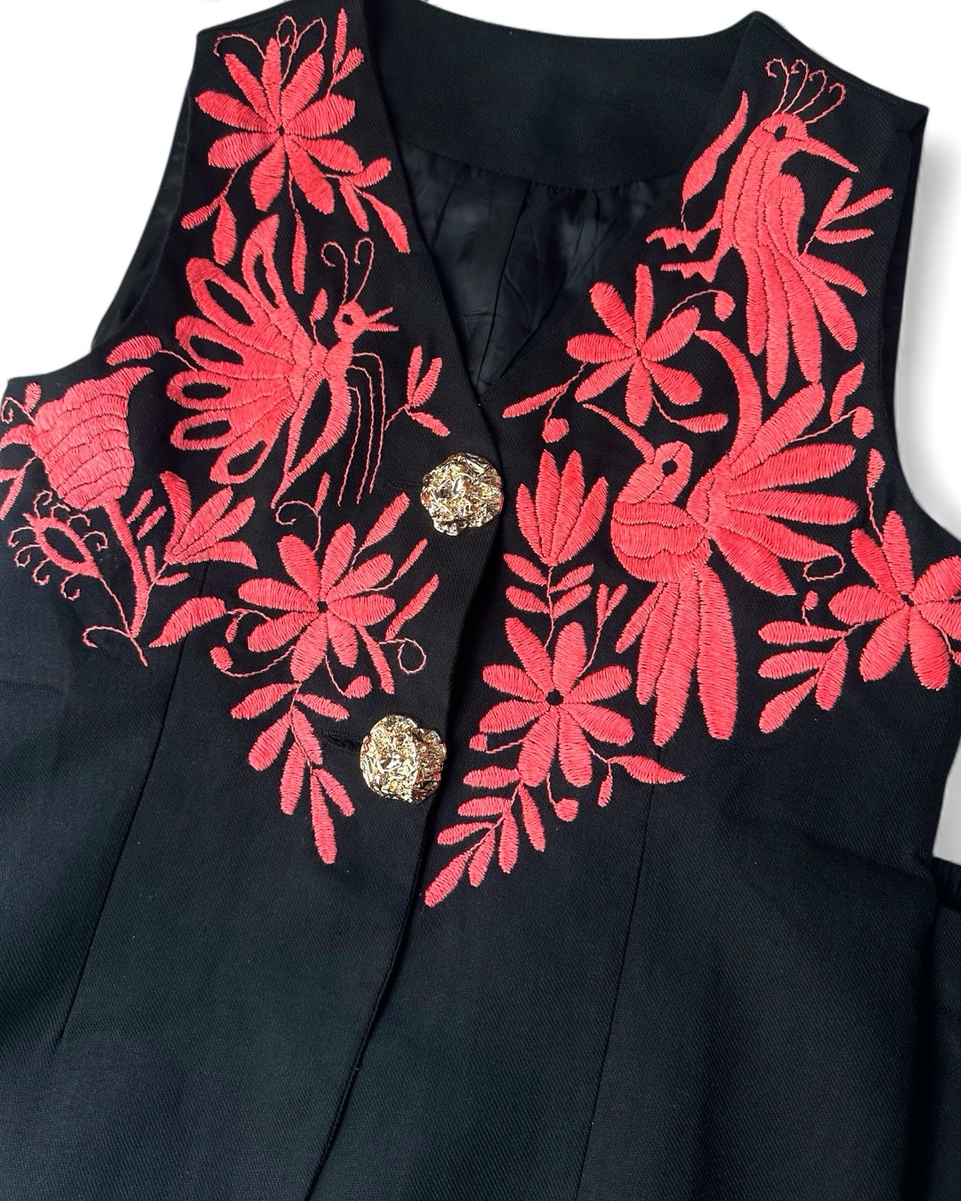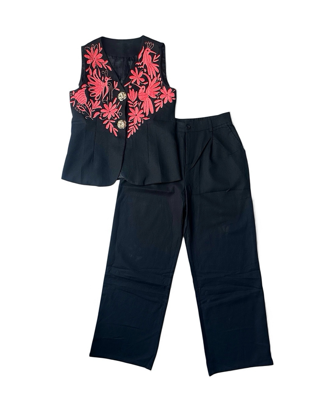 Conjunto talla grande elaborado con tela freedom color negro y con bordado tenango color salmón.