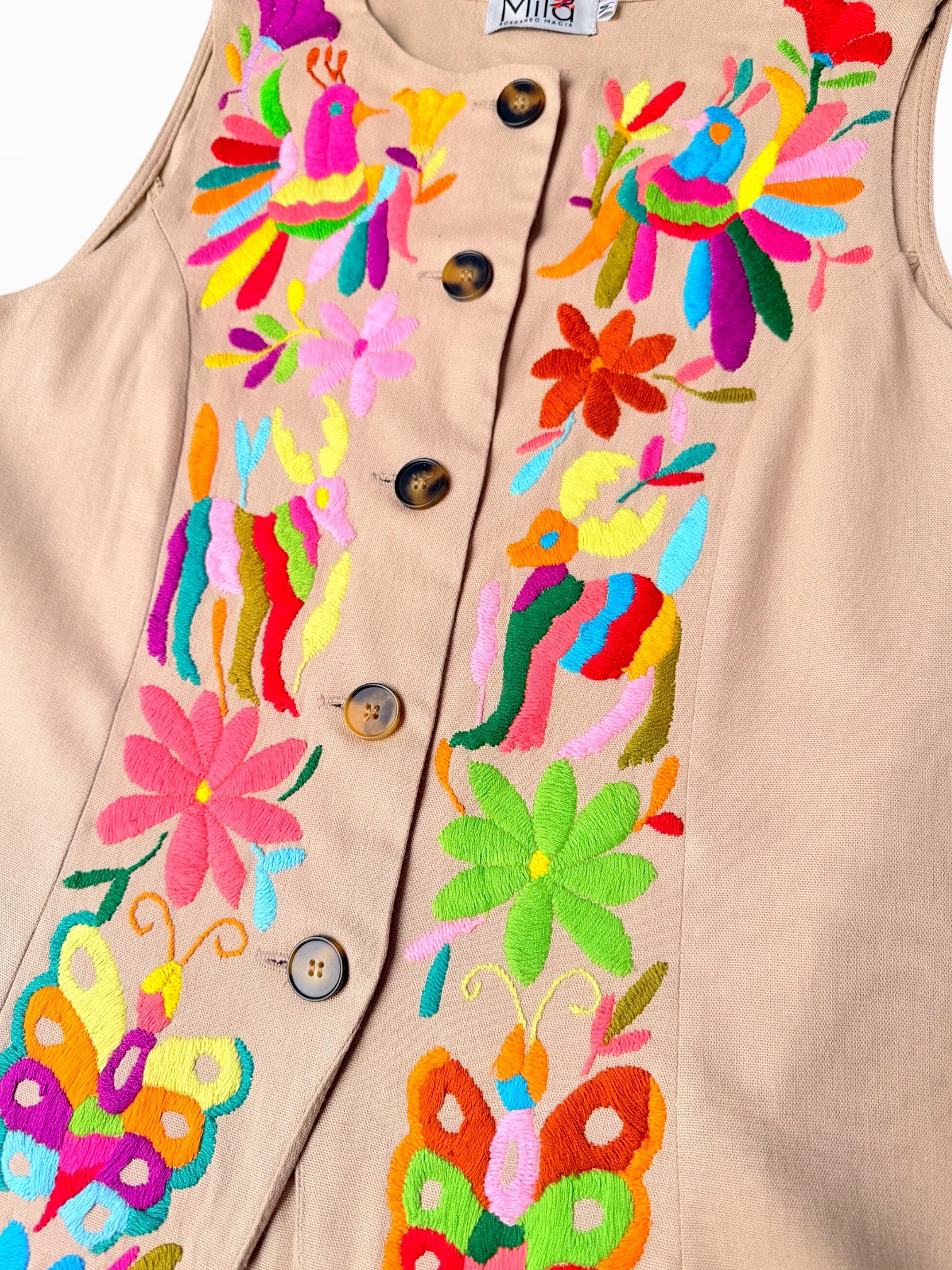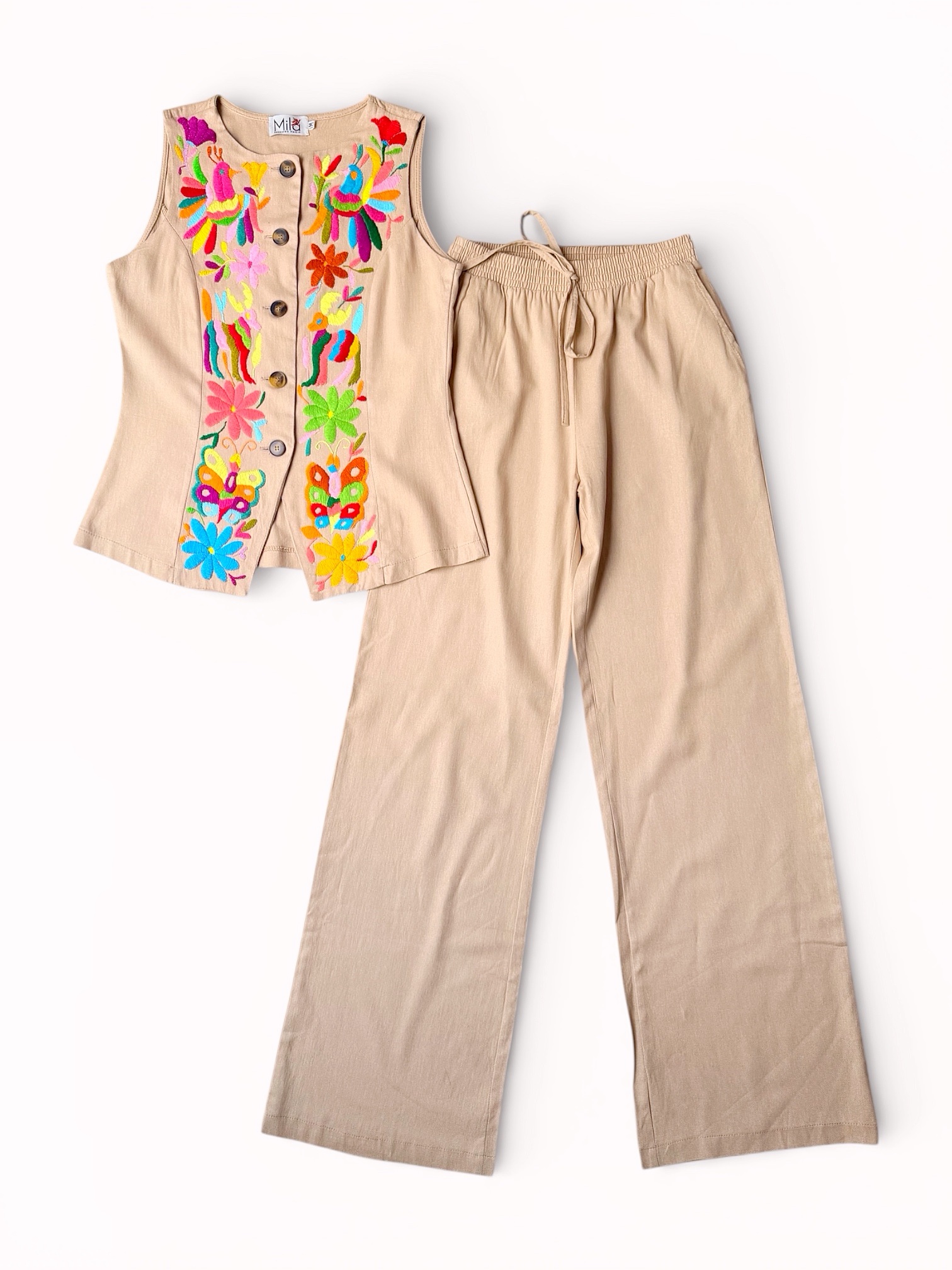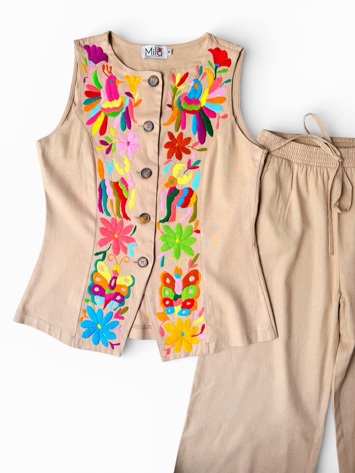 Conjunto de blusa y pantalón talla mediana elaborado con tela de lino color beige y con bordado tenango multicolor.