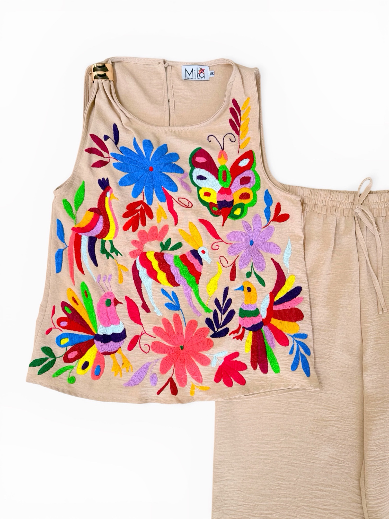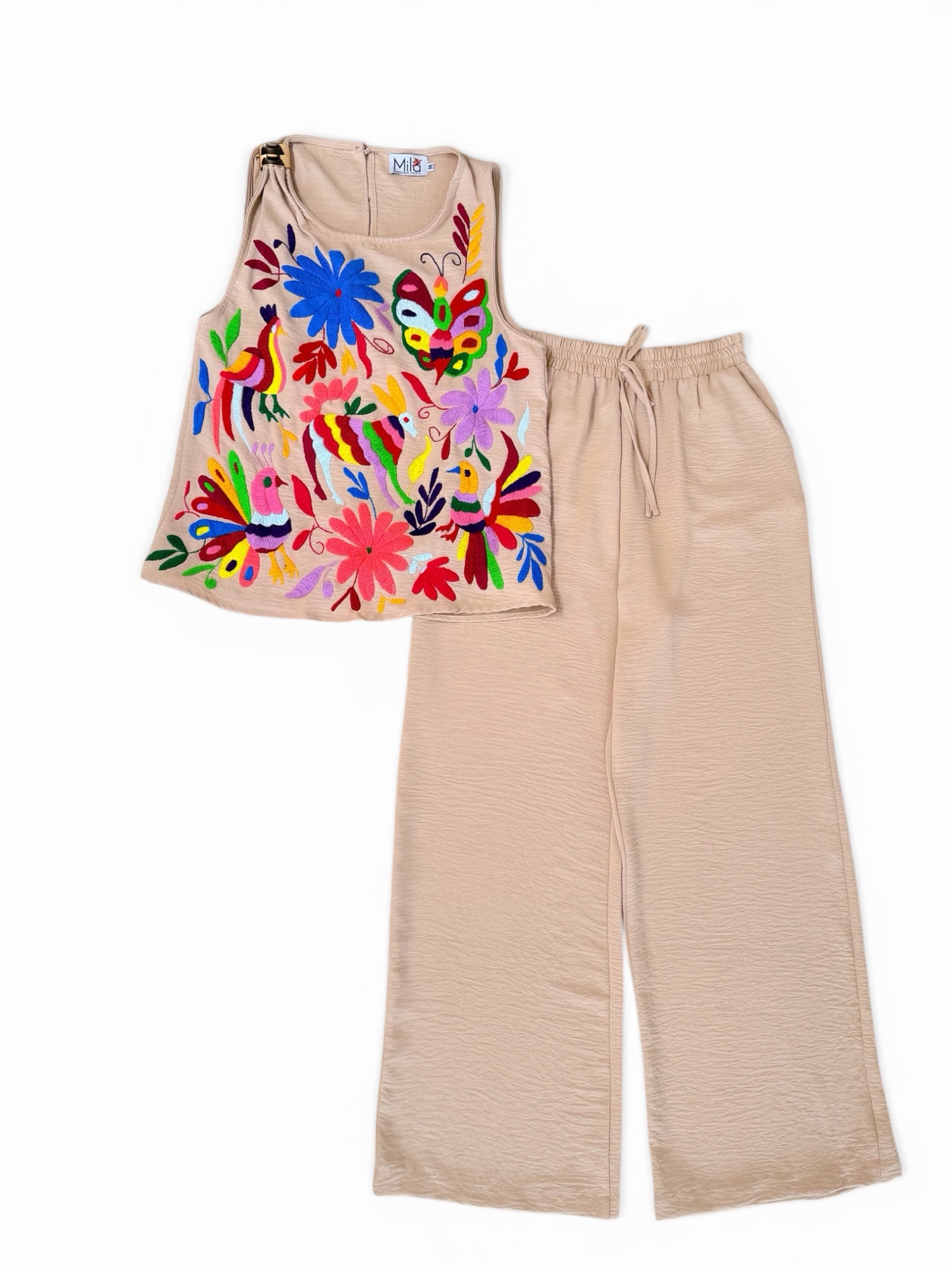 Conjunto talla mediana elaborado con tela cey color beige y con bordado tenango multicolor hecho a mano.