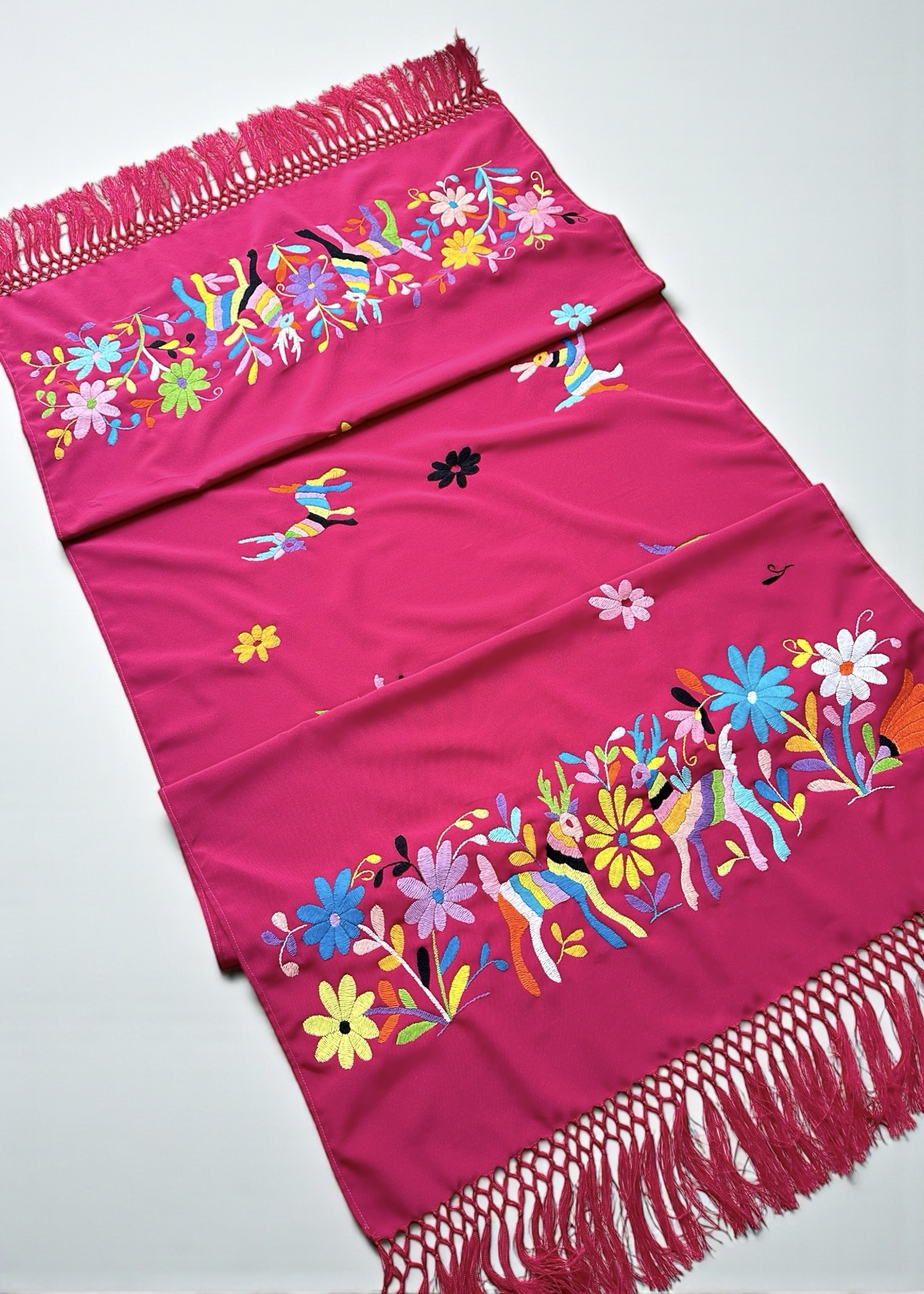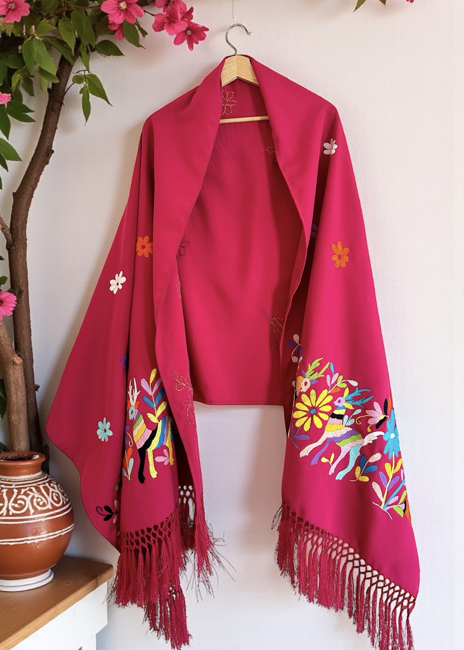 Rebozo Unitalla elaborado con tergal color rosa mexicano y con bordado tenango multicolor hecho a mano.