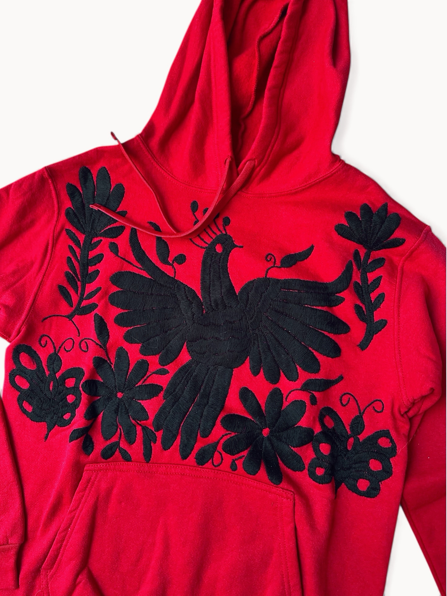 Sudadera afelpada con capucha color rojo con bordado tenango hecho a mano en color negro.