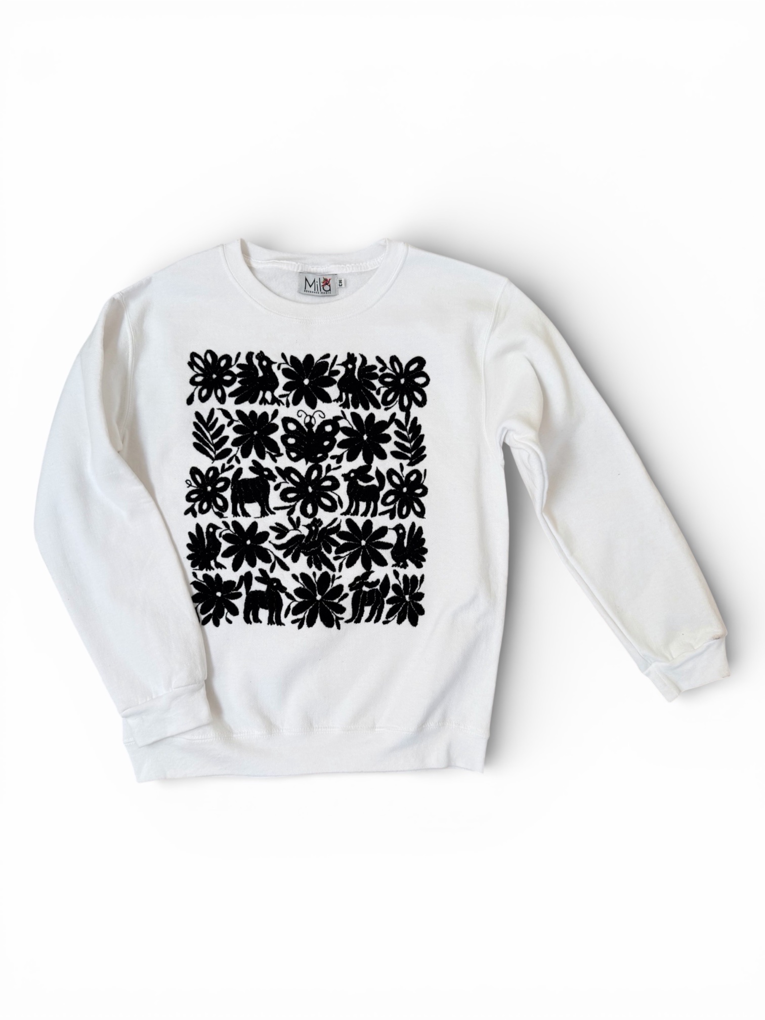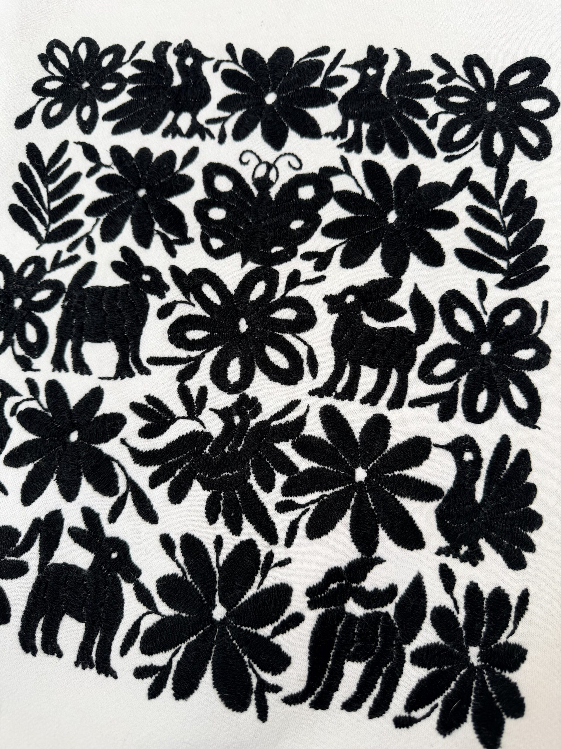 Sudadera Unisex talla chica color blanco elaborado con tela afelpada y con bordado tenango color negro hecho a mano.