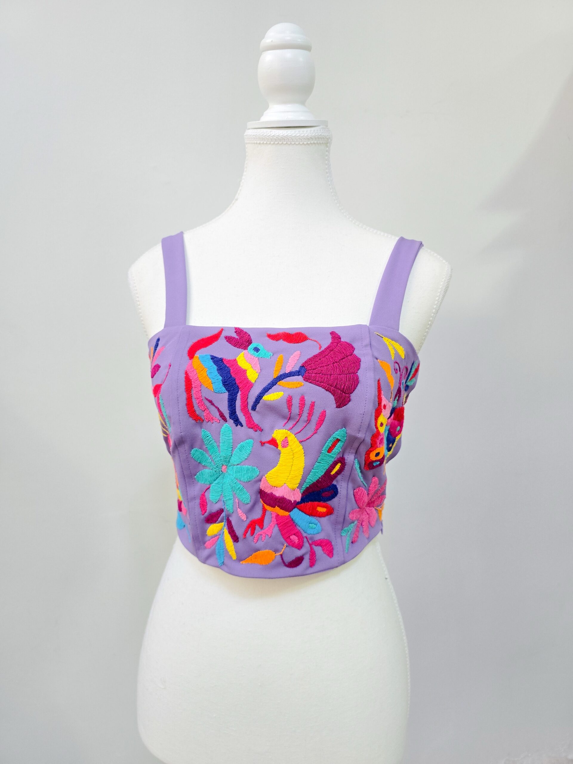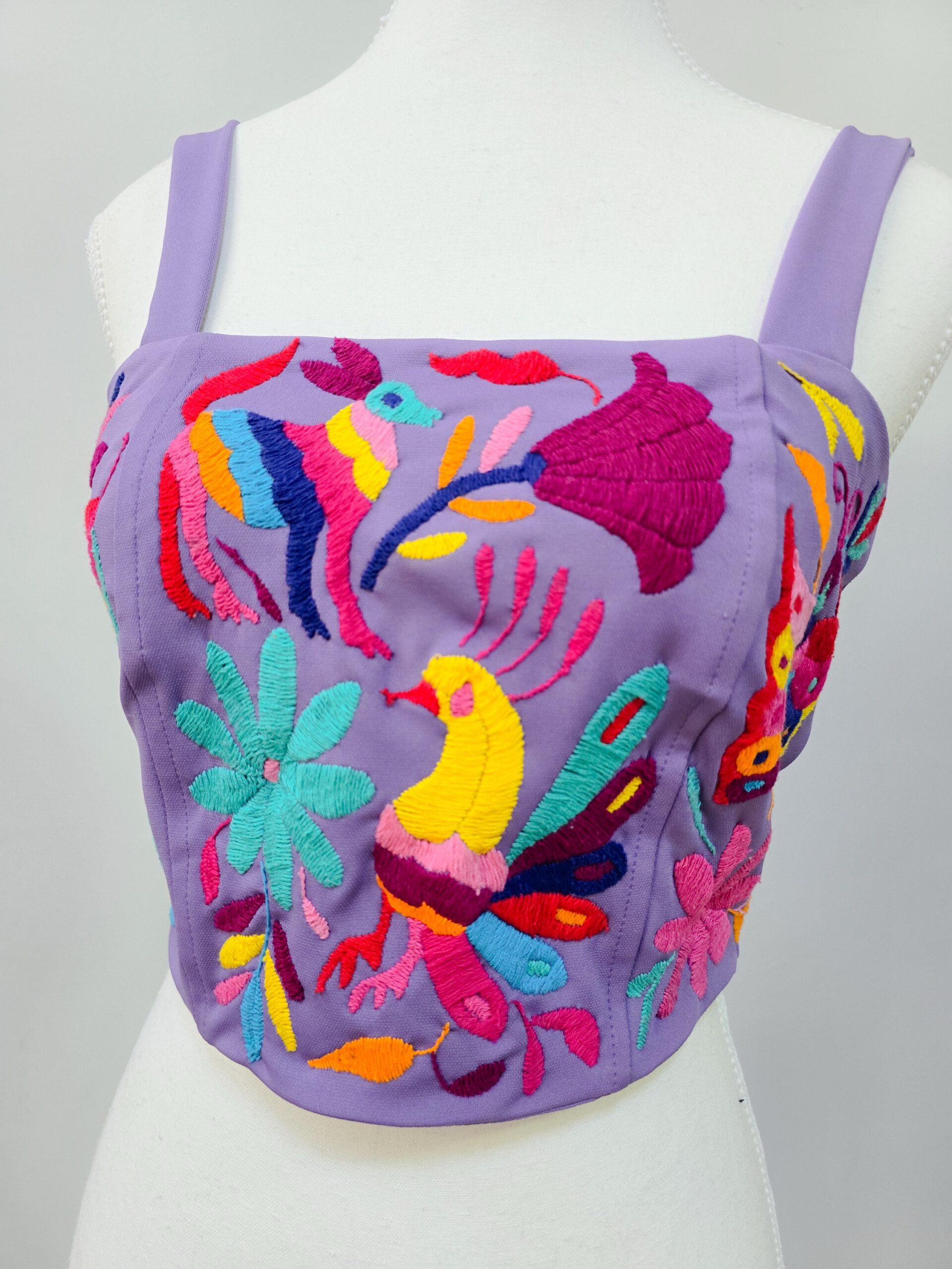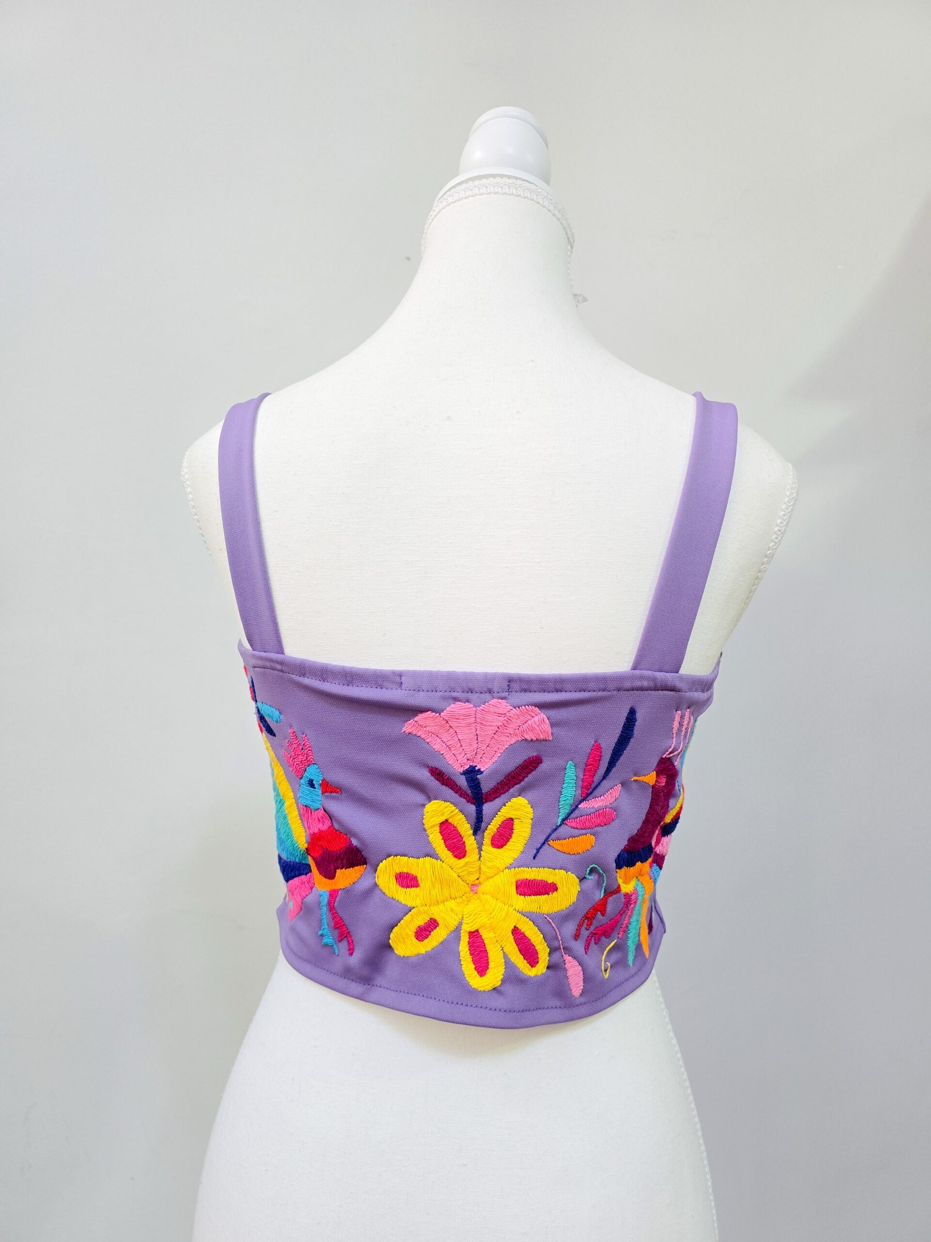 Crop top color morado elaborado con tela techno que contiene spandex y con bordado tenango multicolor. Lleva cierre al costado.