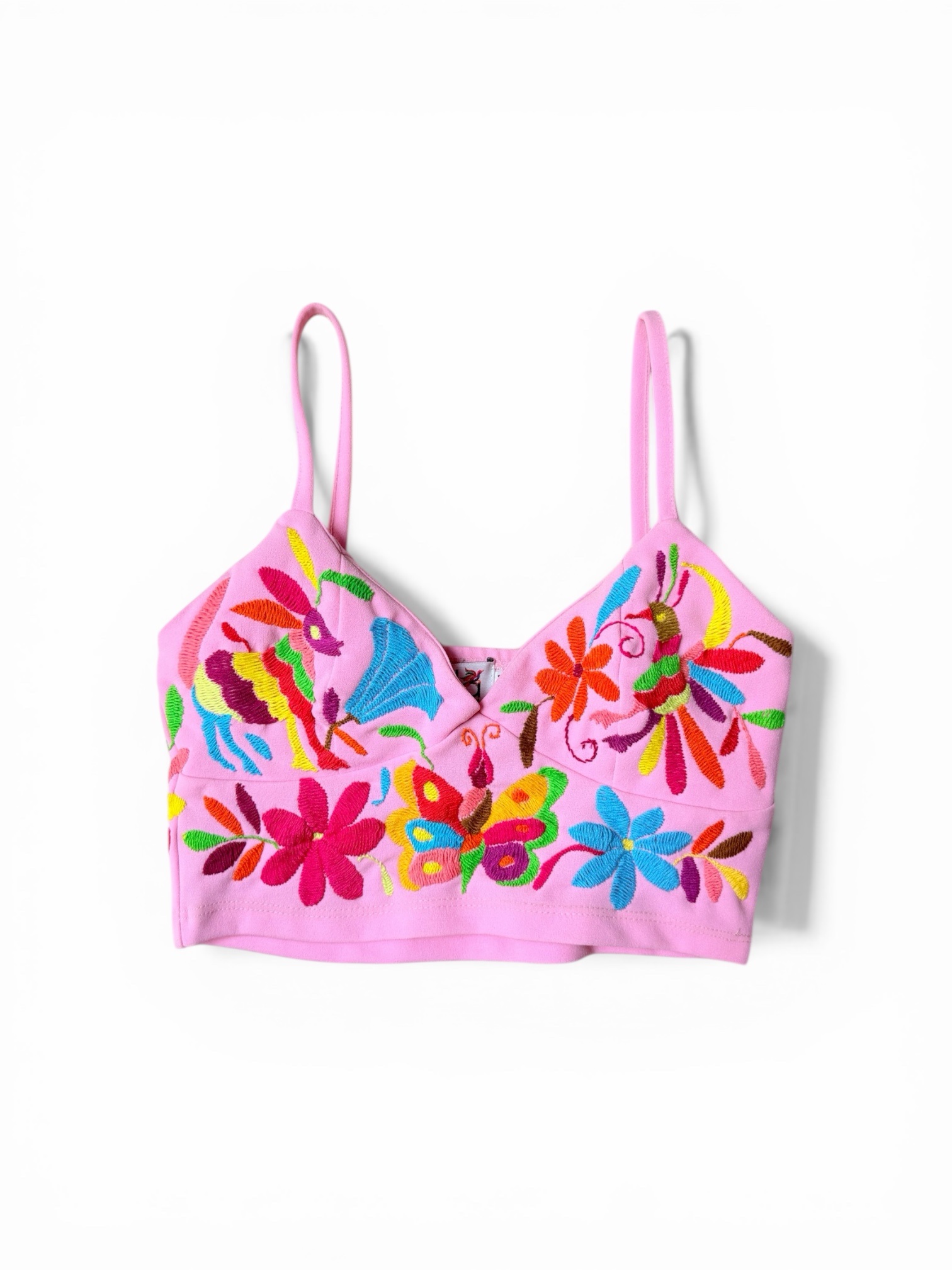 Top talla chica elaborado con tela techno crepé color rosa y con bordado tenango multicolor. La tela contiene spandex.