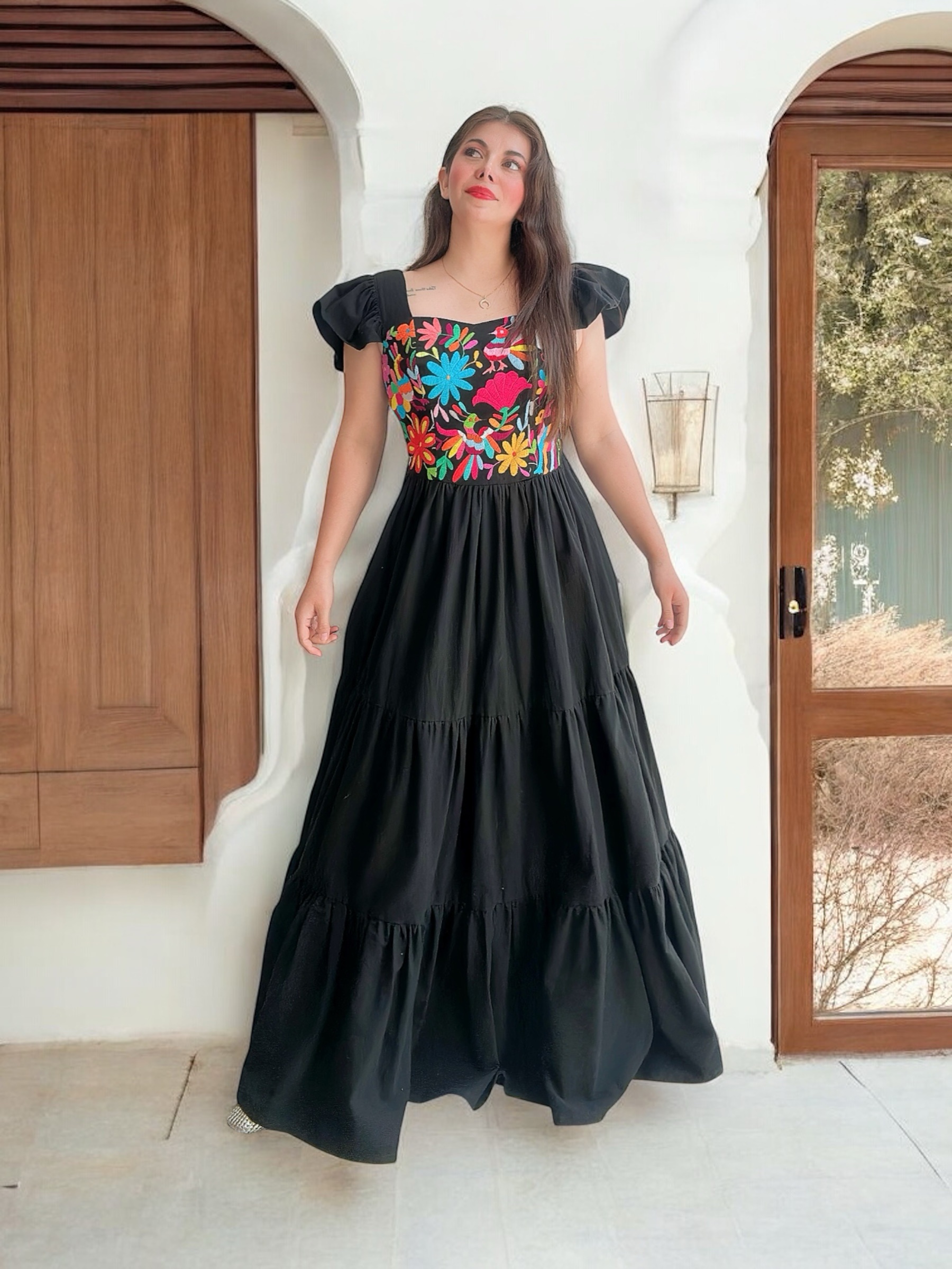 Vestido negro talla chica elaborado con manta prelavada de algodón y con bordado tenango multicolor.