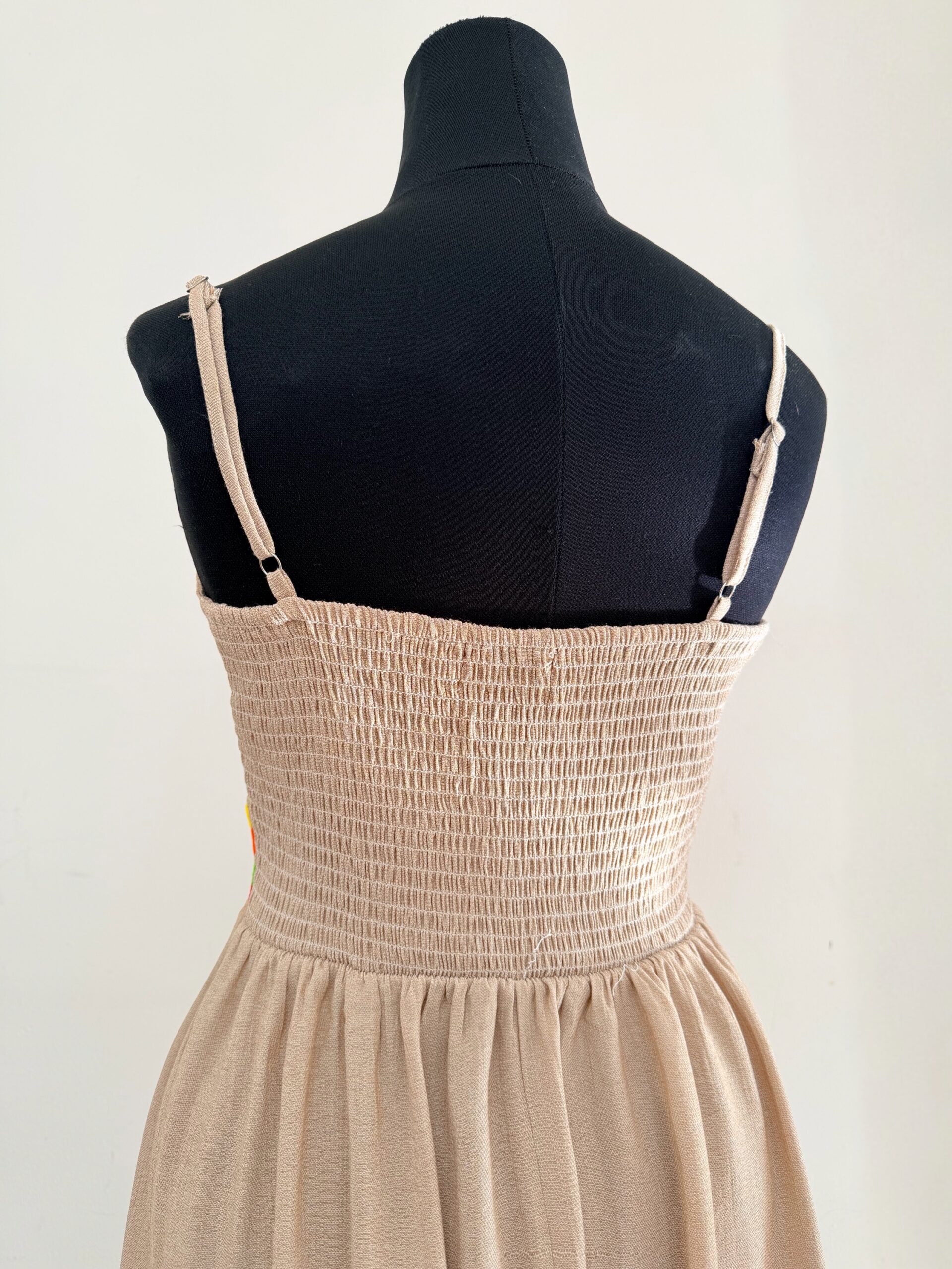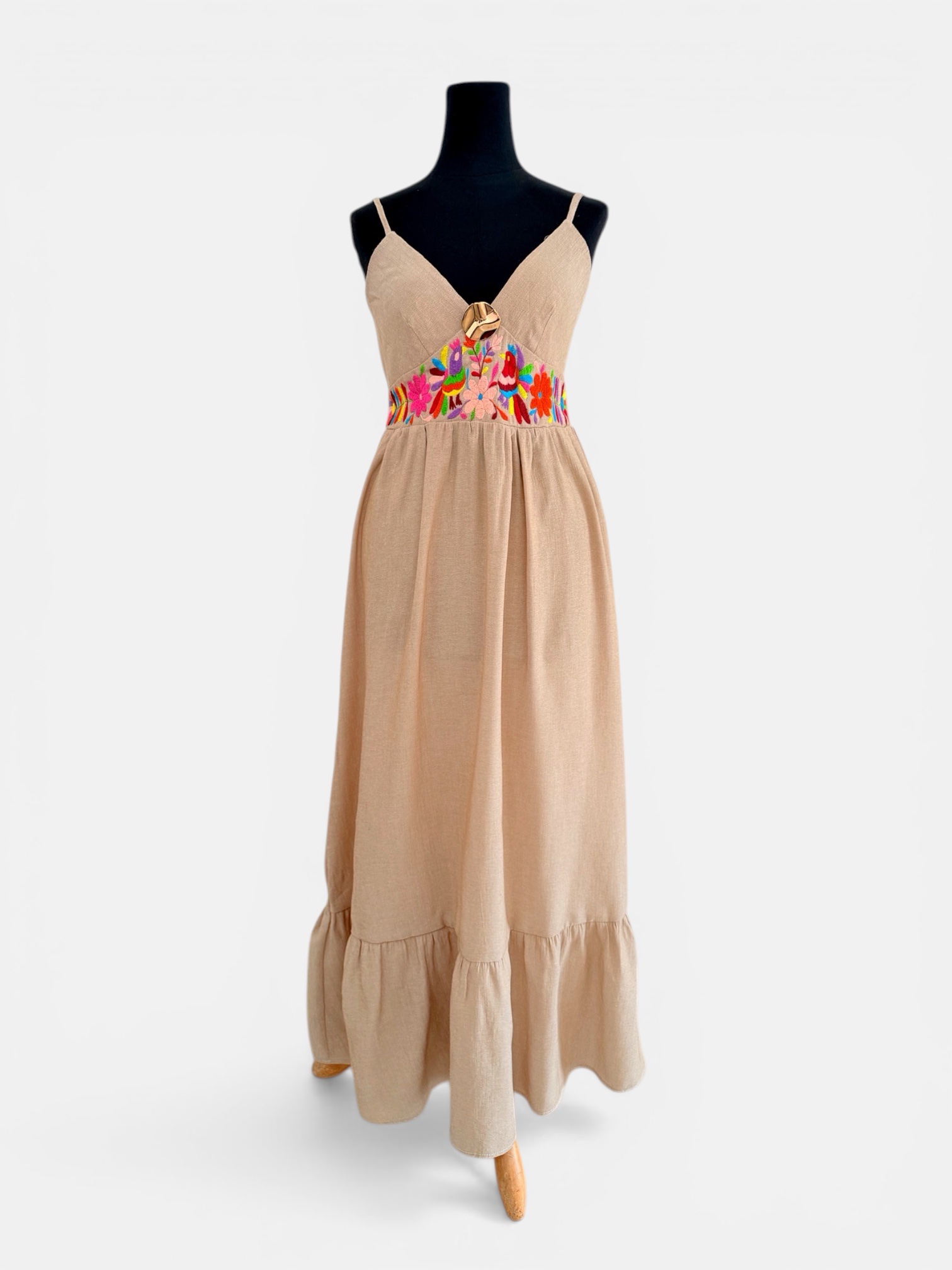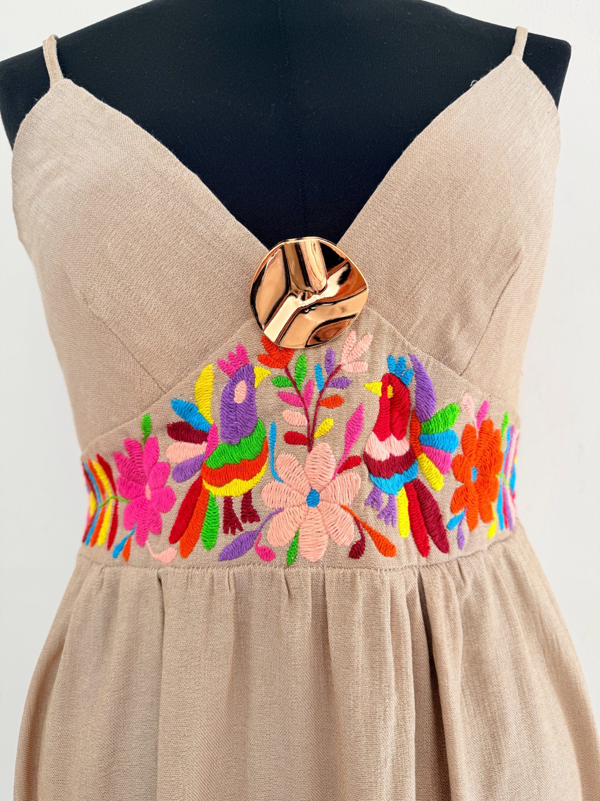 Vestido talla grande, elaborado con tela de lino color arena y con bordado tenango multicolor hecho a mano.