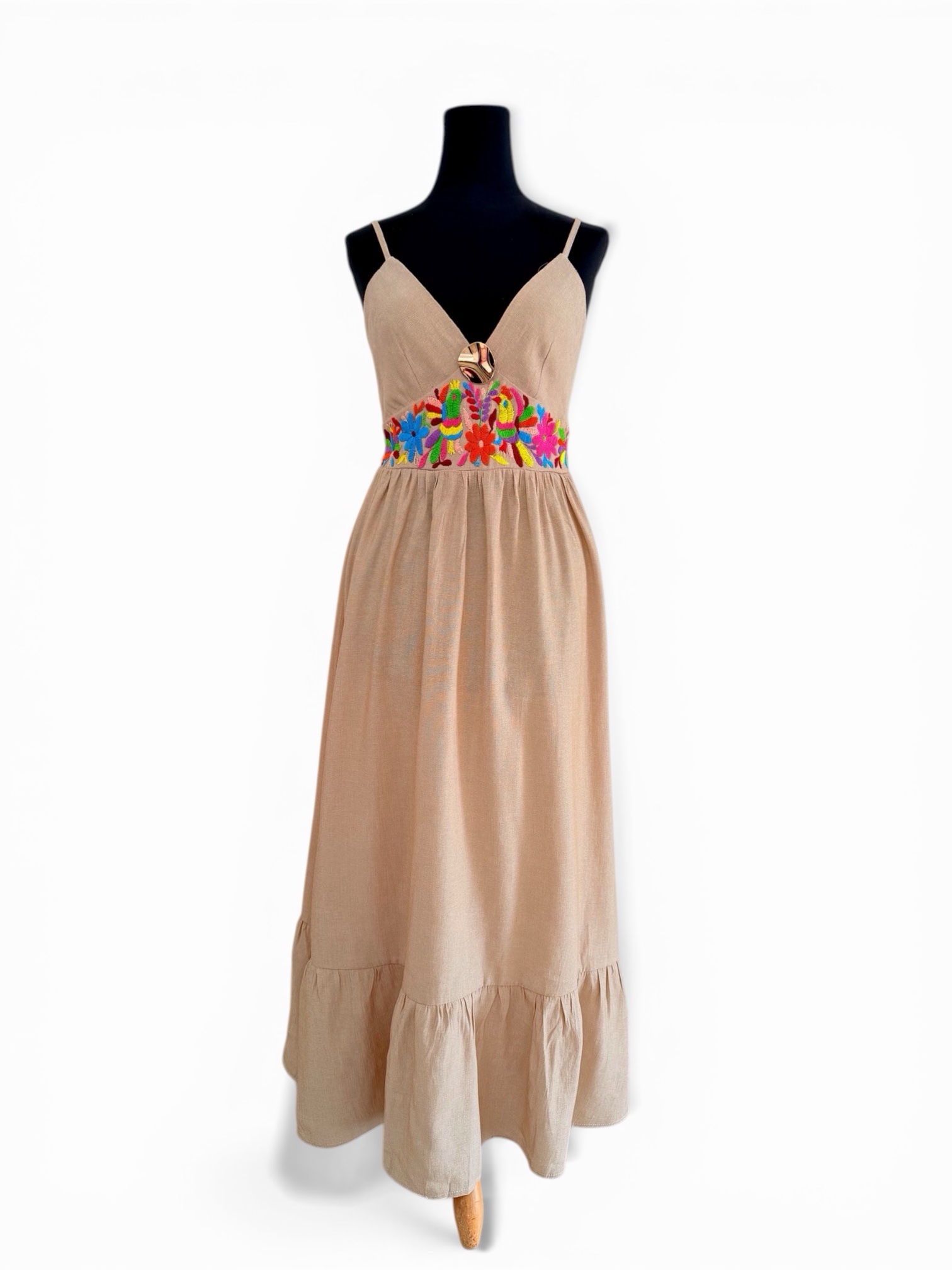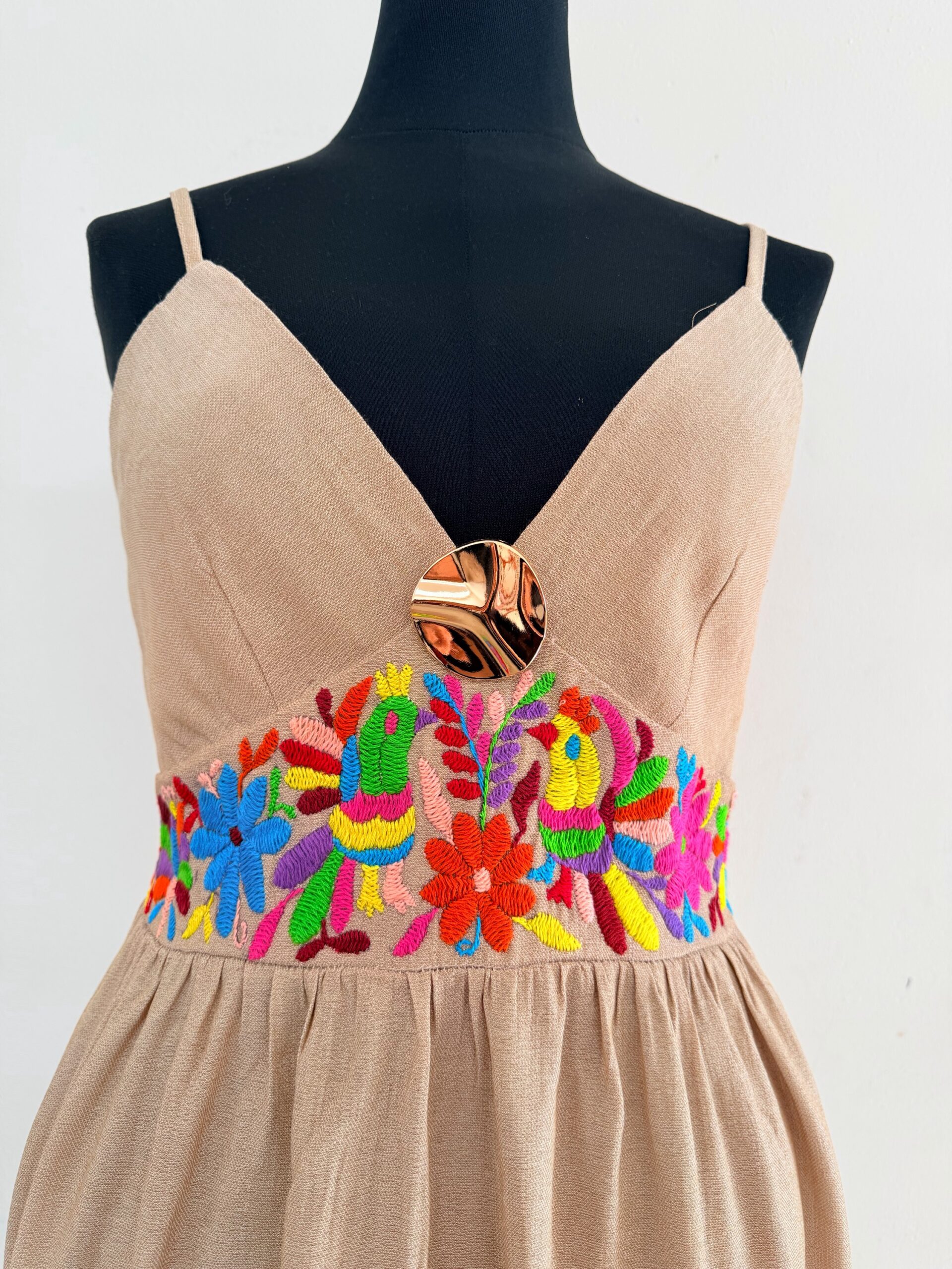 Vestido talla grande, elaborado con tela de lino color arena y con bordado tenango multicolor hecho a mano.