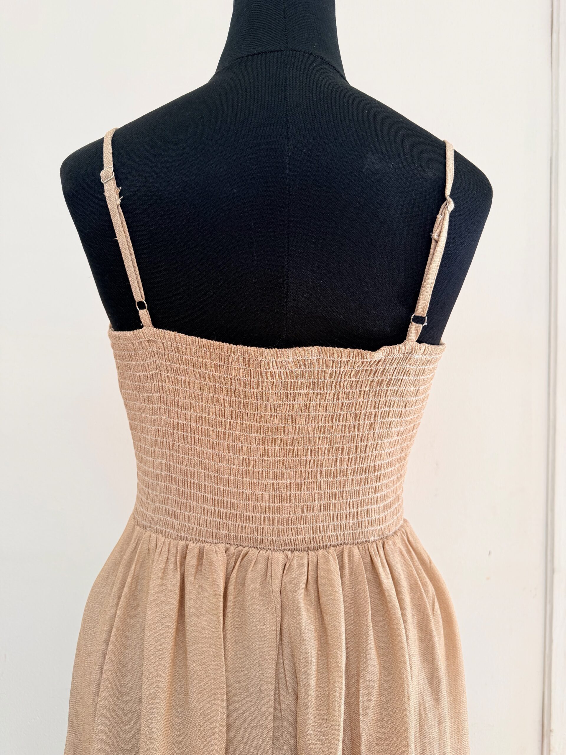 Por la parte de la espalda lleva elástico que de reposo mide de contorno busto 88 cm y estira a 102 cm y de contorno cintura en reposo mide 72 cm y estira a 93 cm.