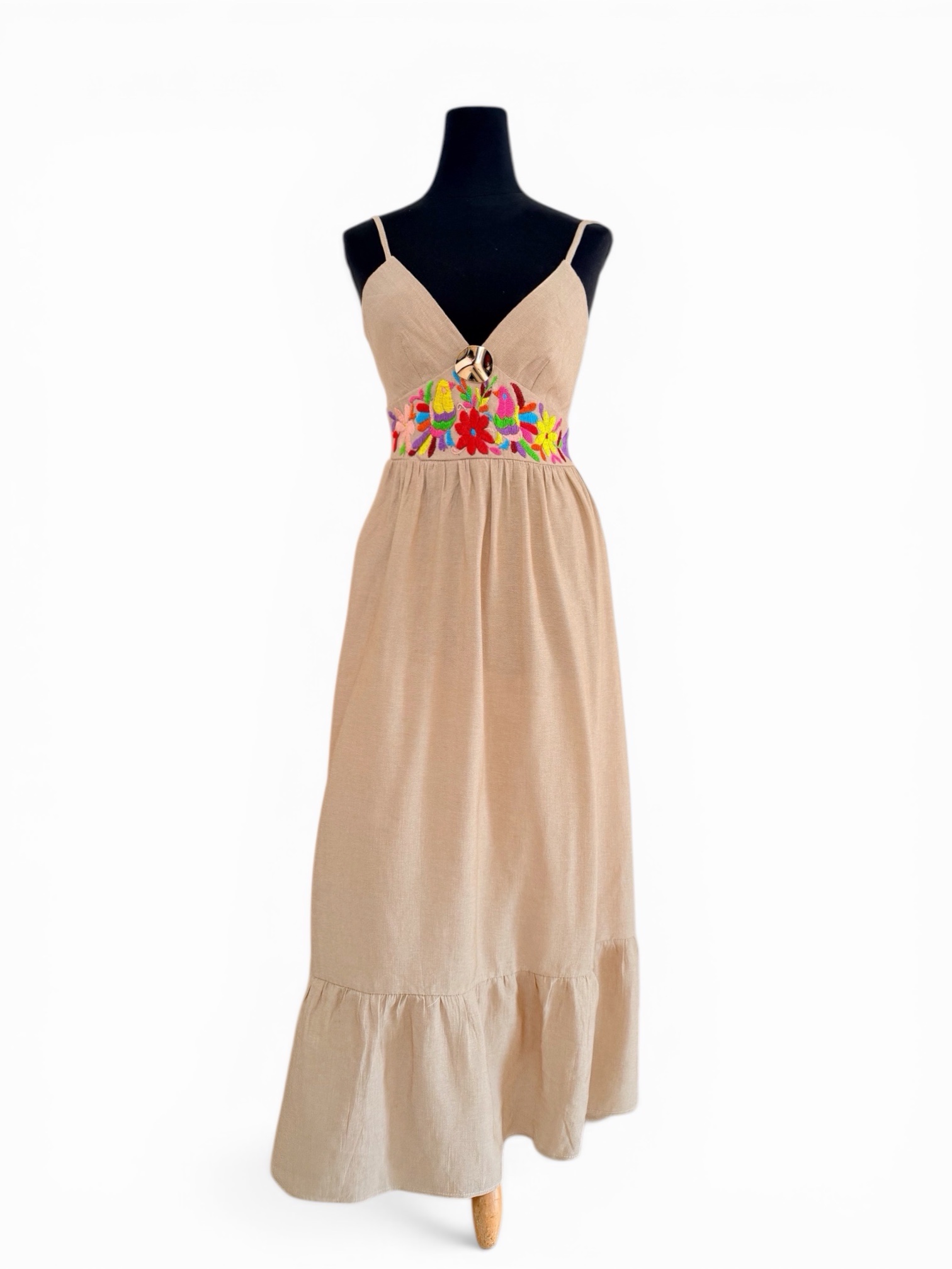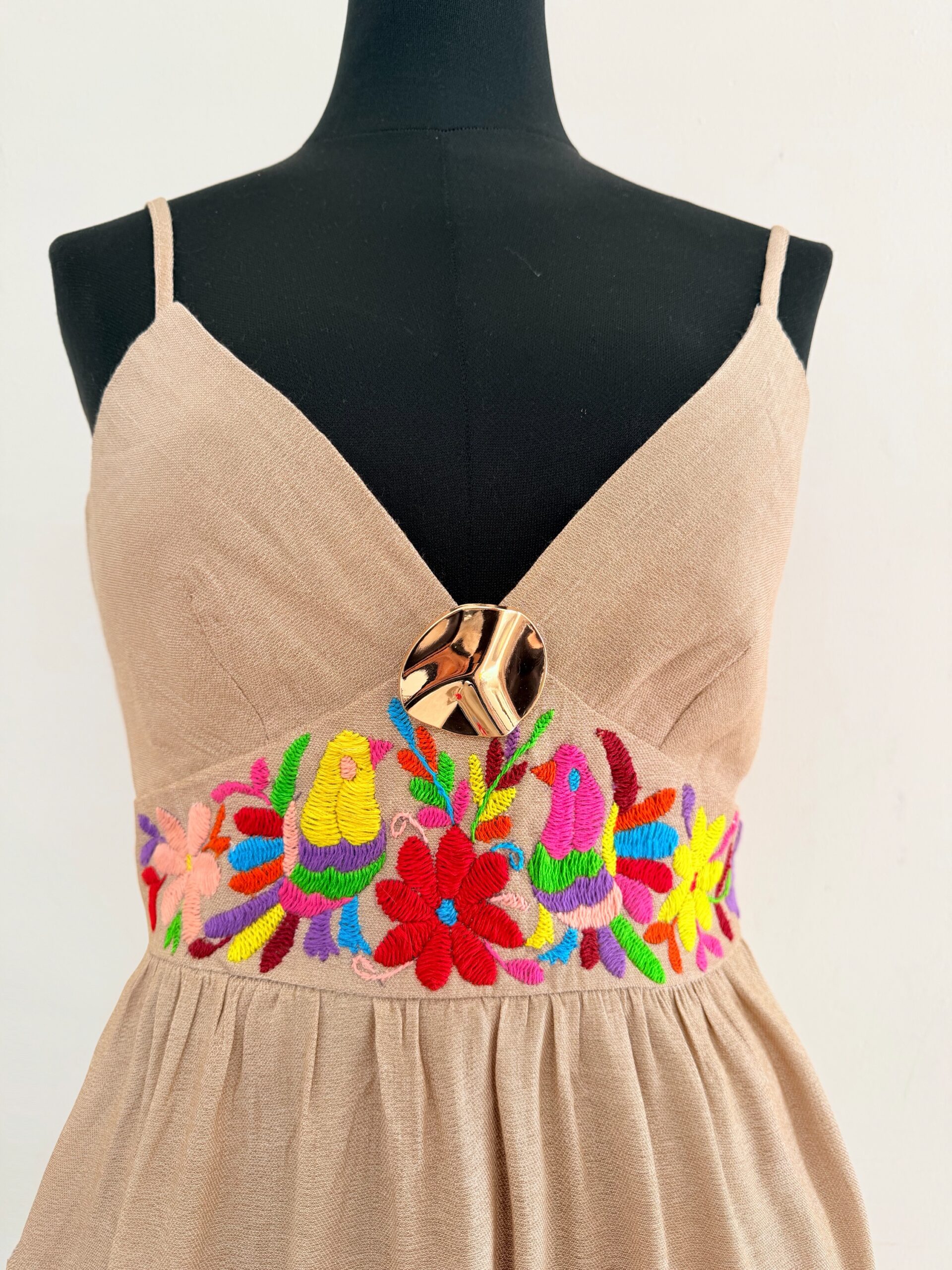 Vestido talla mediana, elaborado con tela lino color arena y con bordado tenango multicolor hecho a mano.
