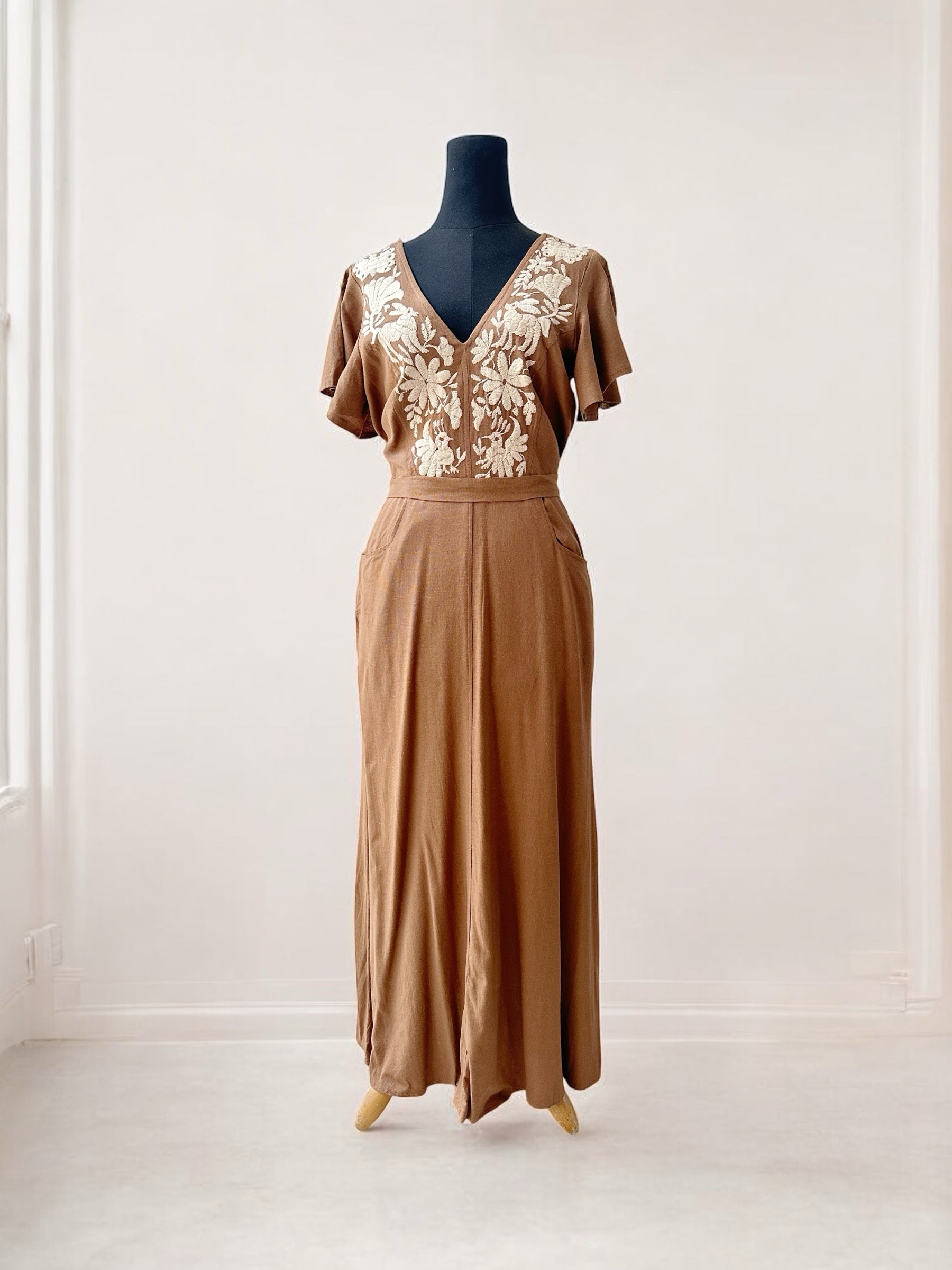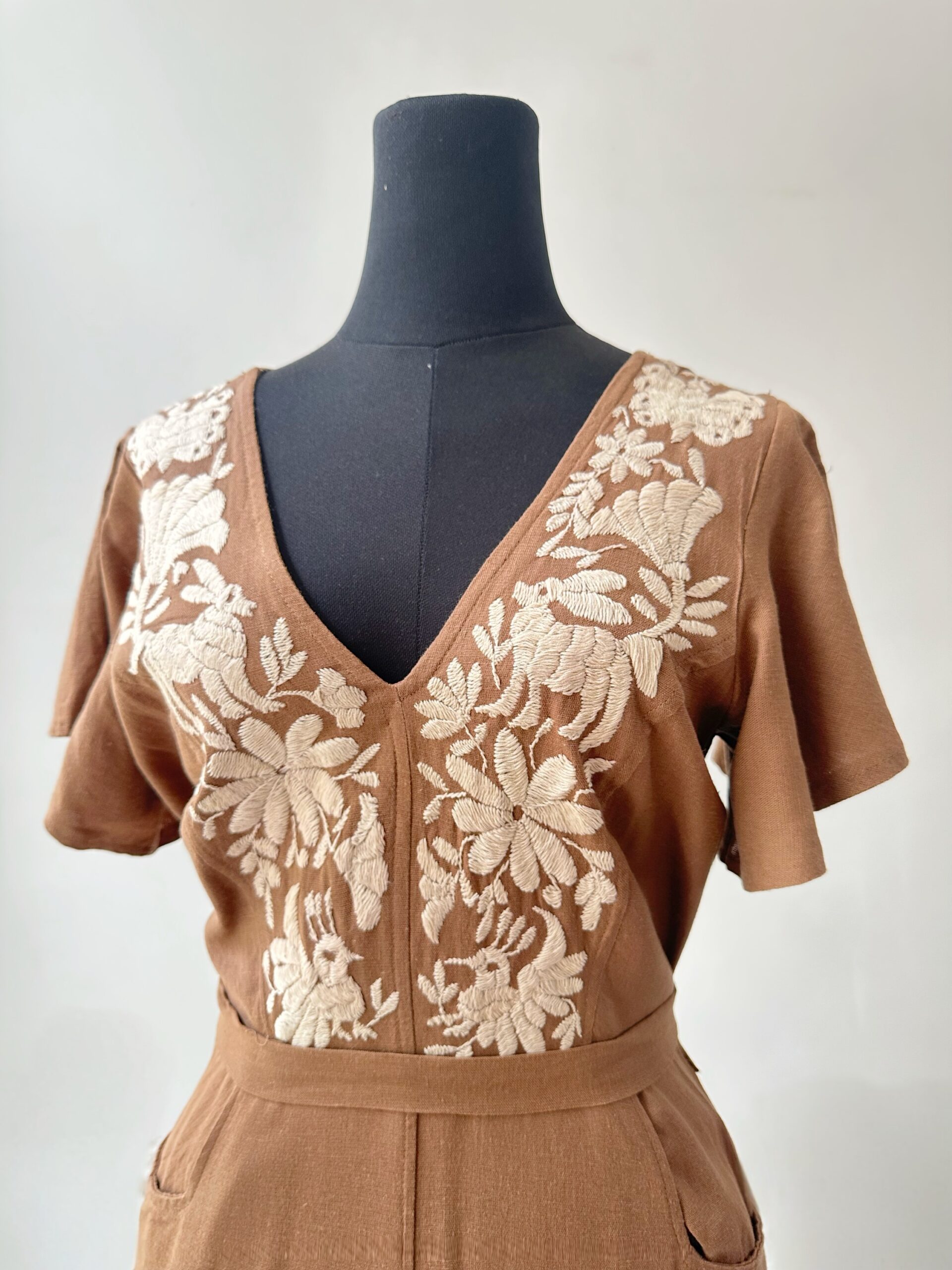 Vestido color moca, talla grande, elaborado con lino y con bordado tenango color beige. Incluye cinta.