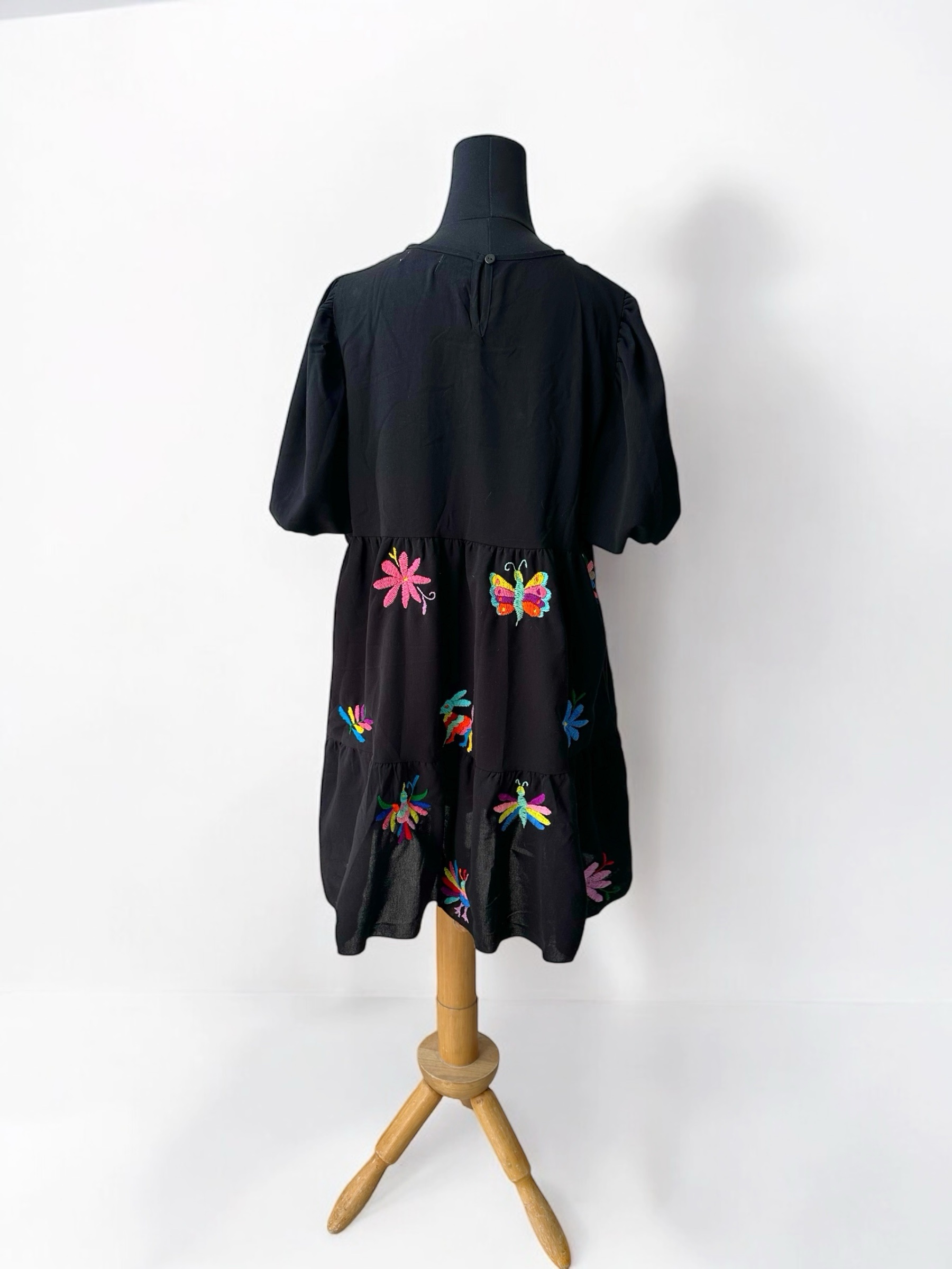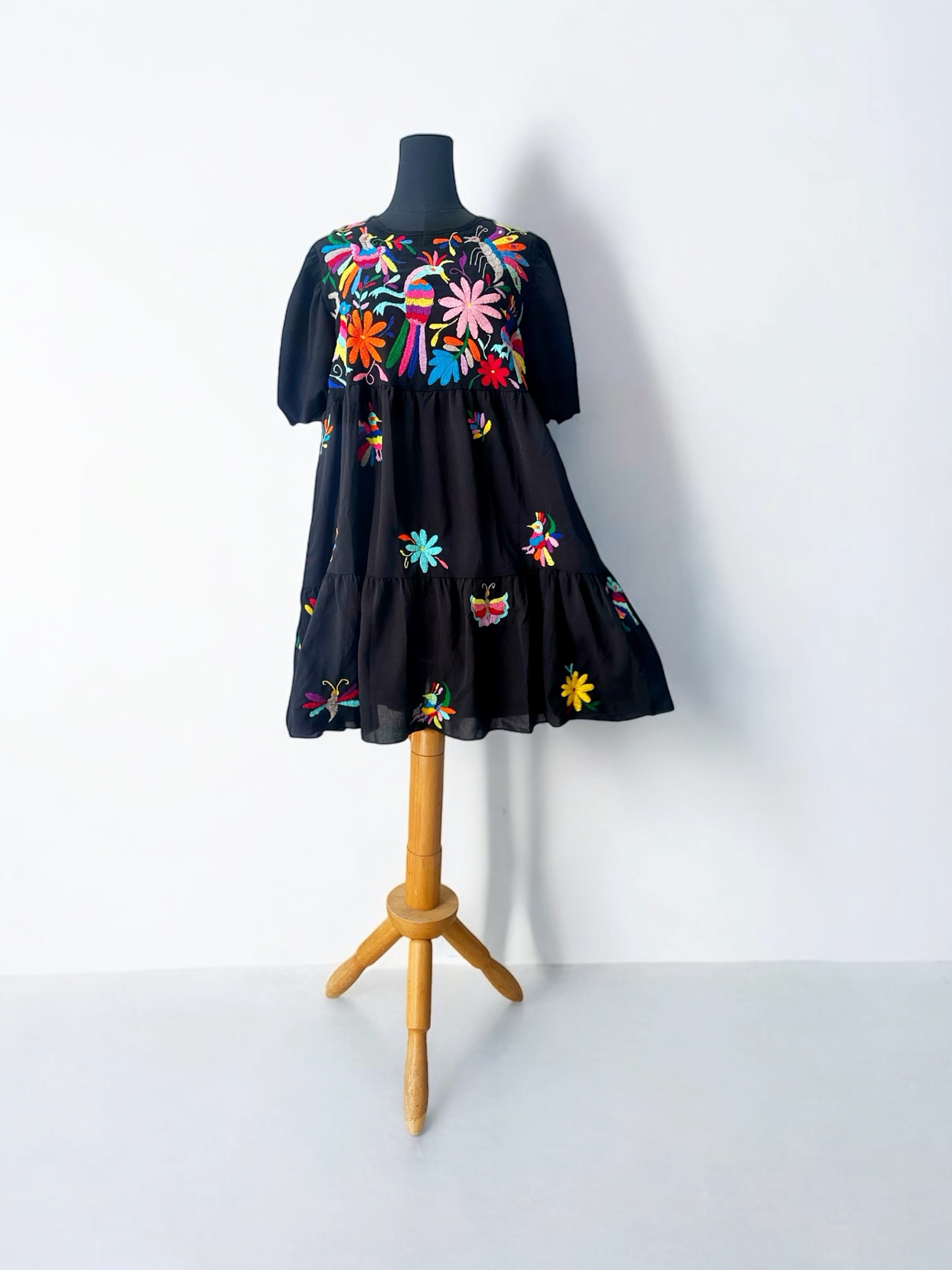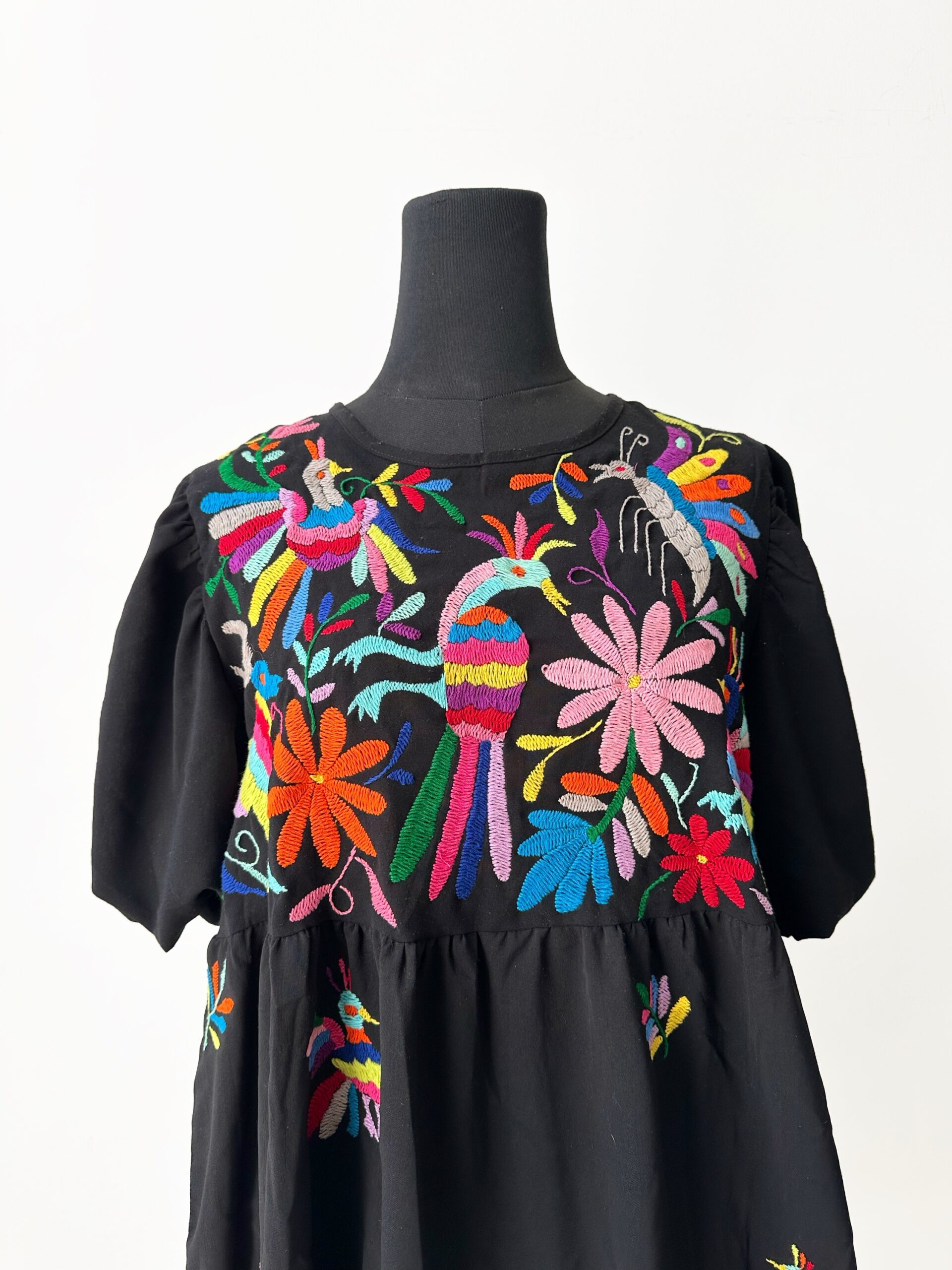 Vestido color negro, elaborado con tela viscosa y con bordado tenango multicolor.