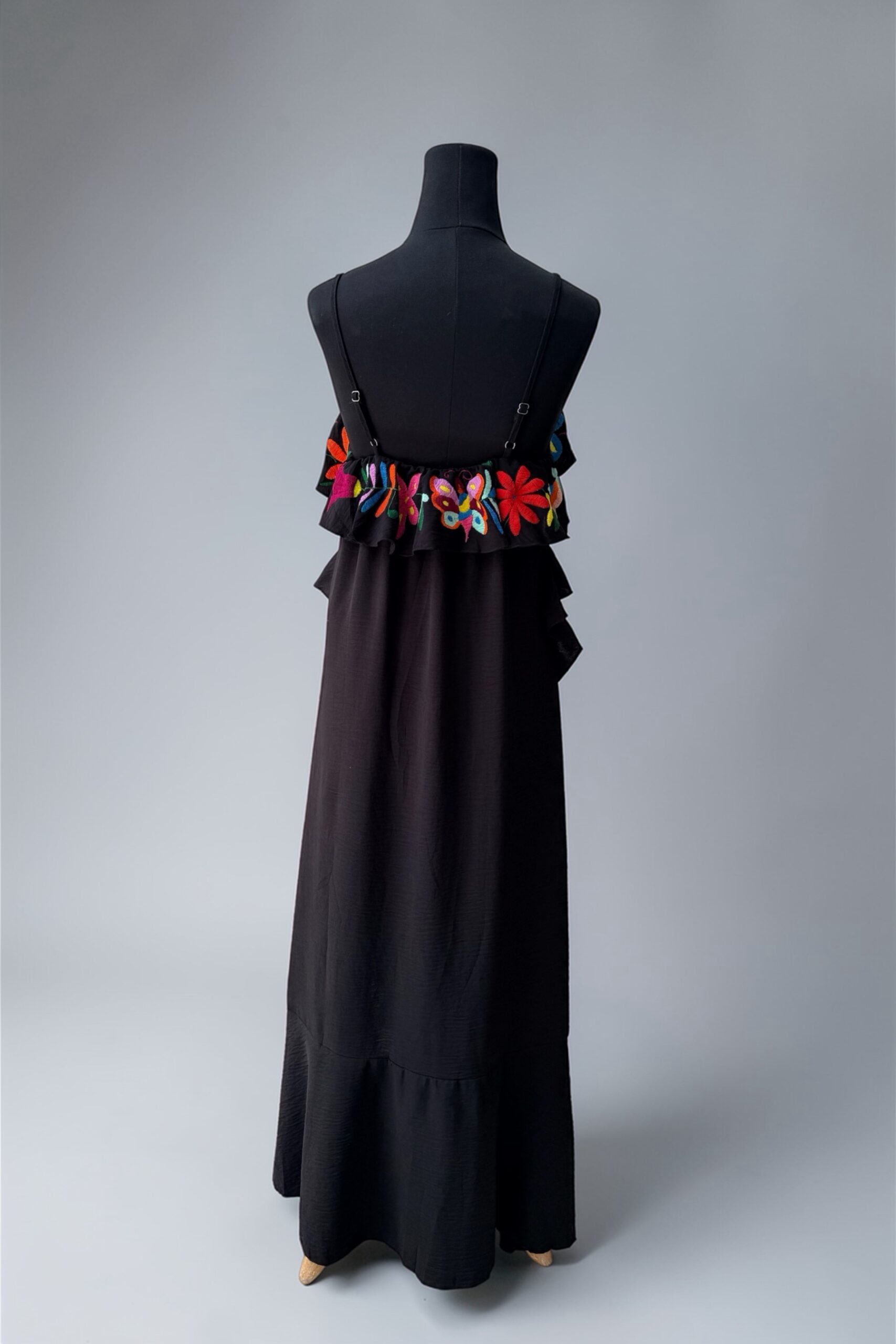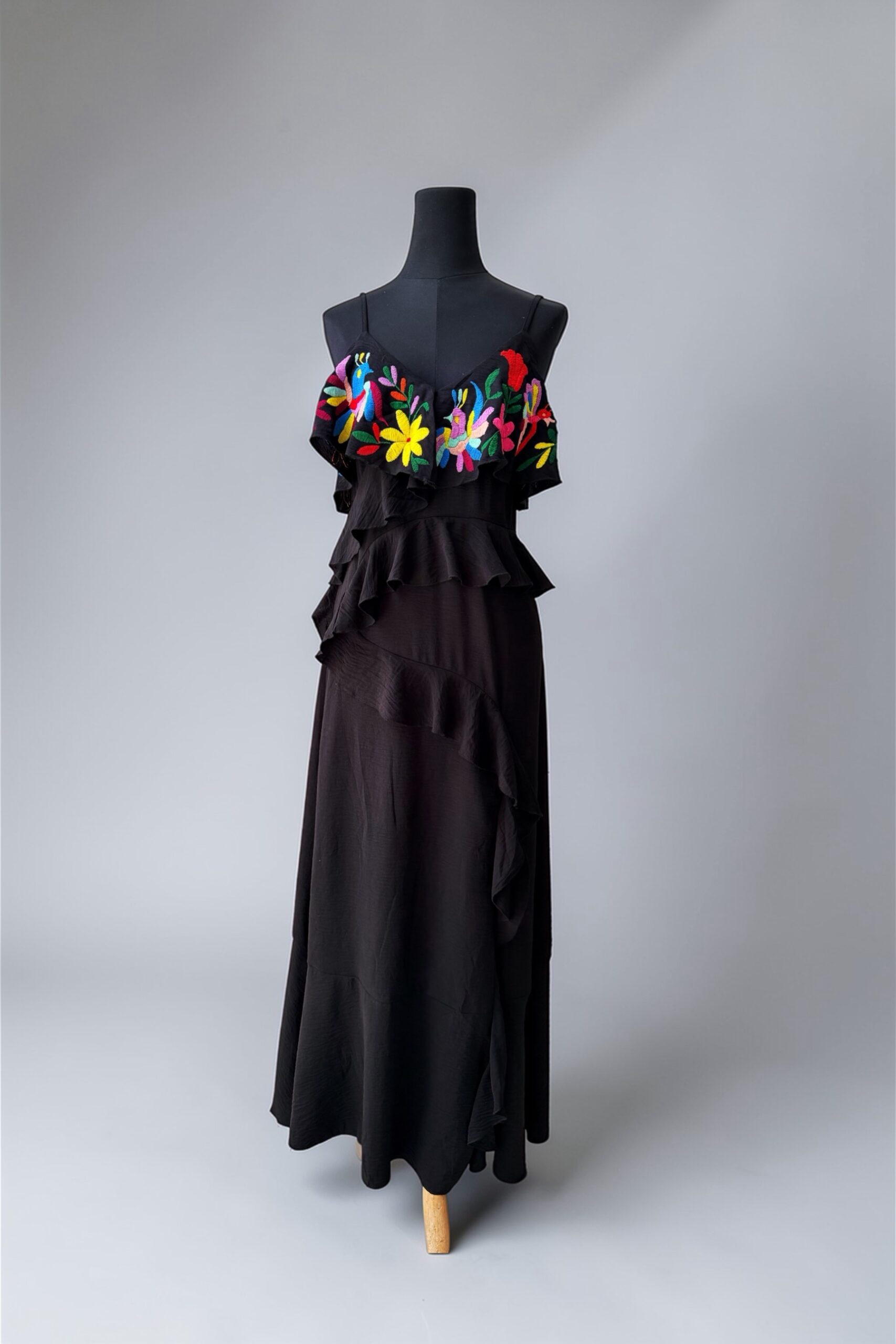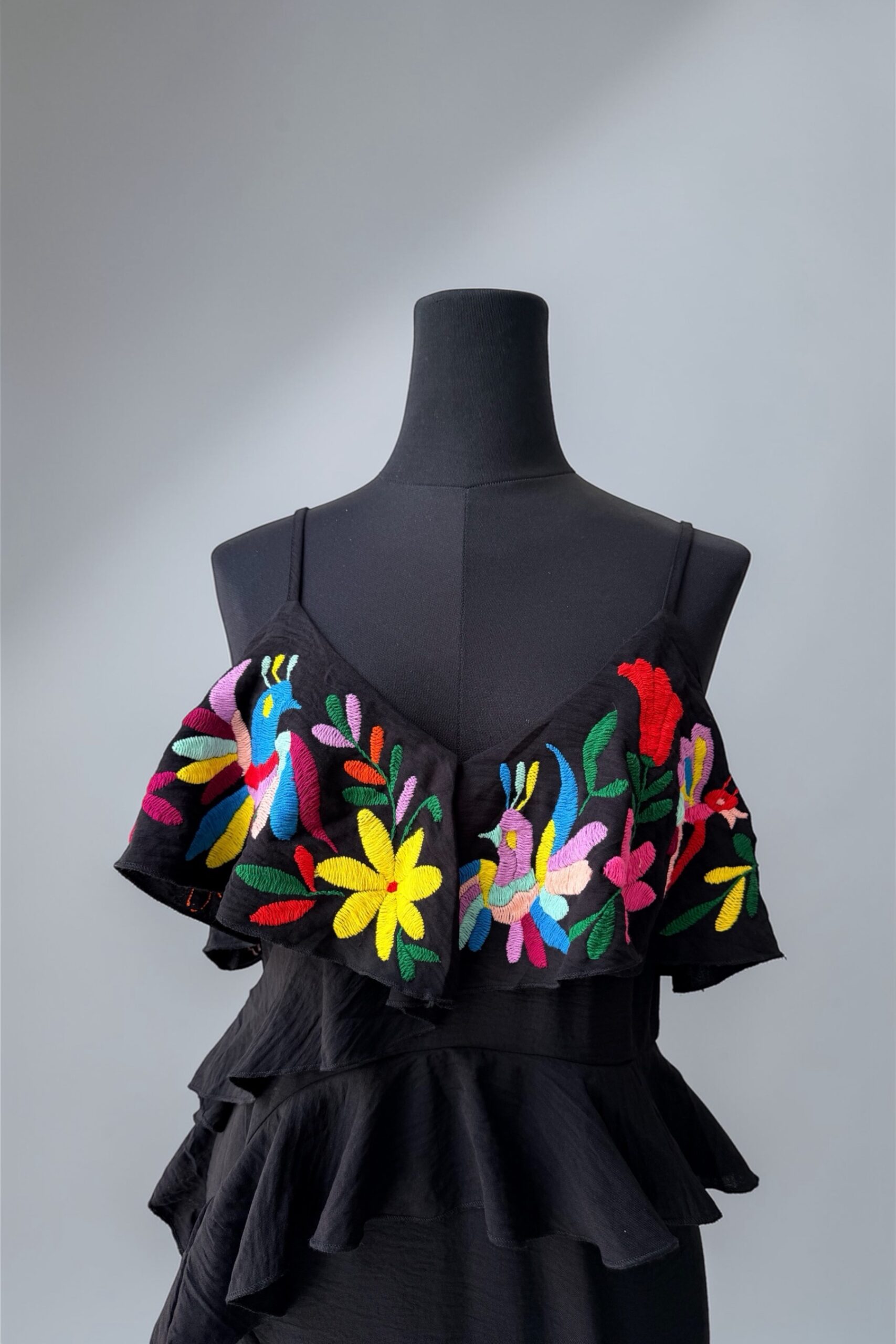 Vestido olanes talla chica elaborado con tela cey y con bordado tenango multicolor hecho a mano.
