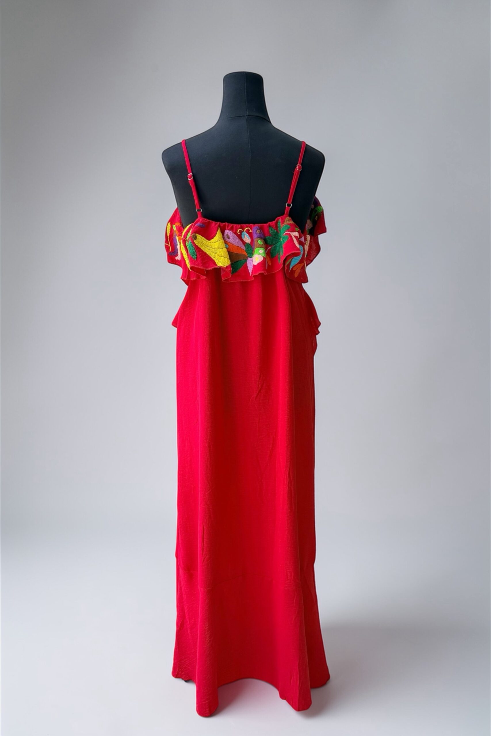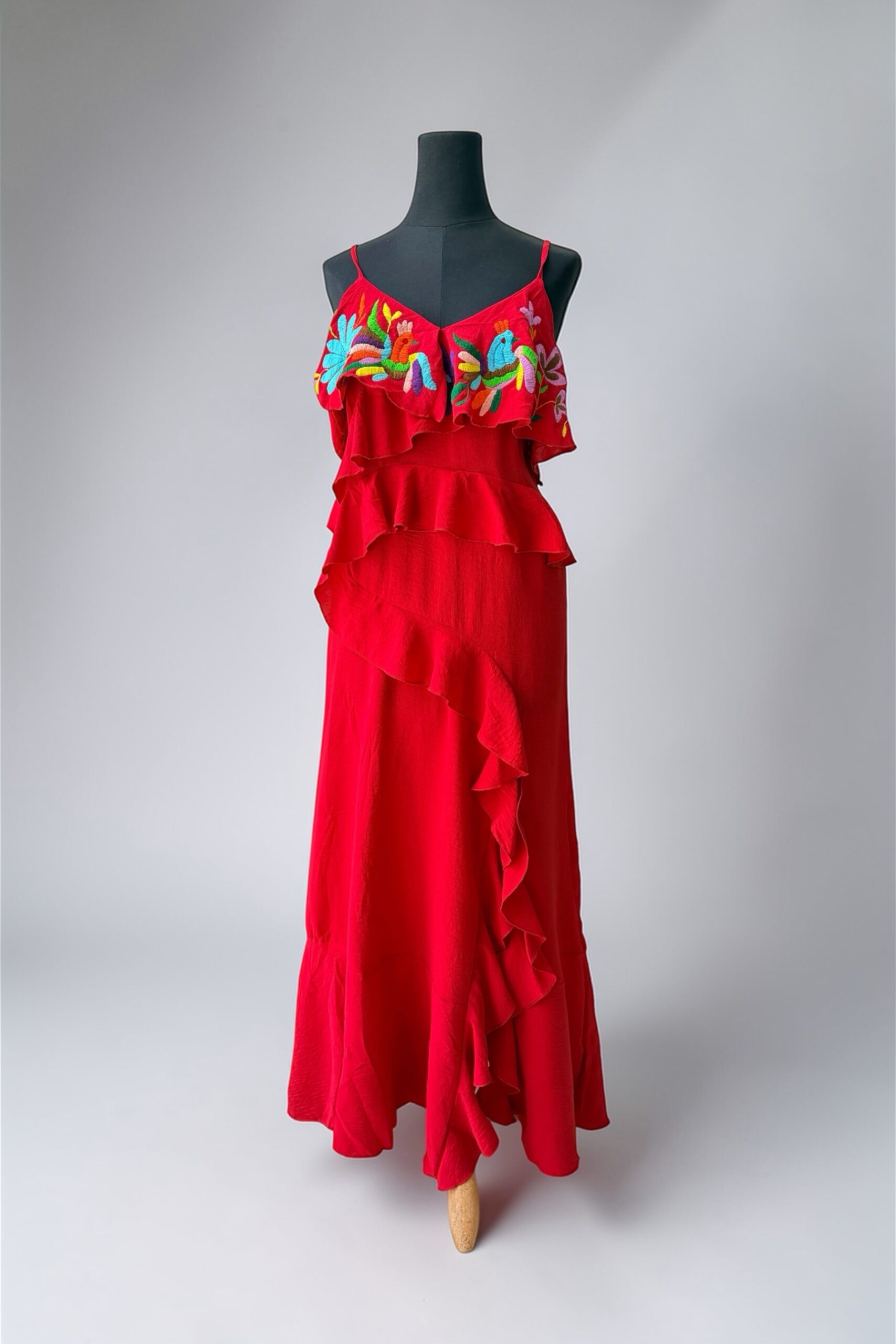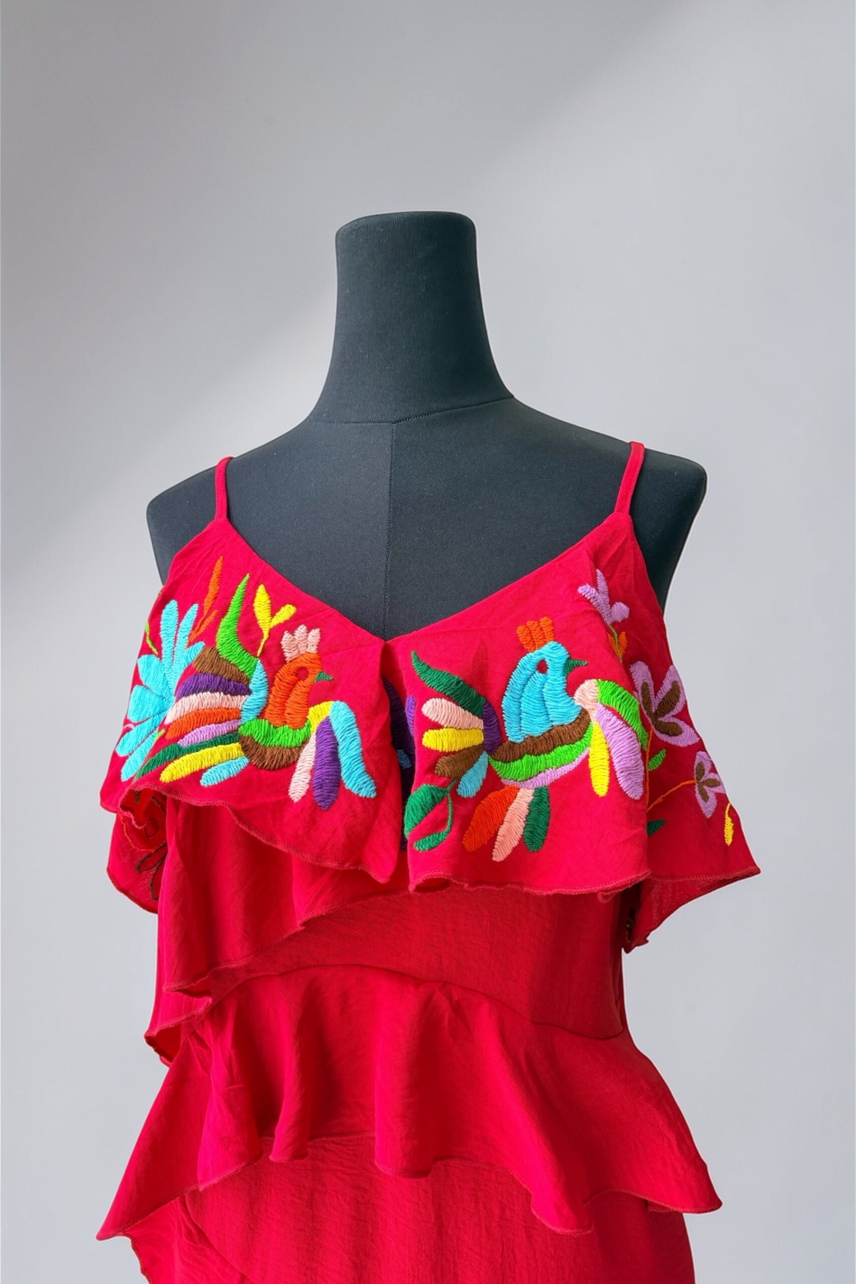 Vestido talla grande, color rojo, elaborado con tela cey y con bordado tenango multicolor.