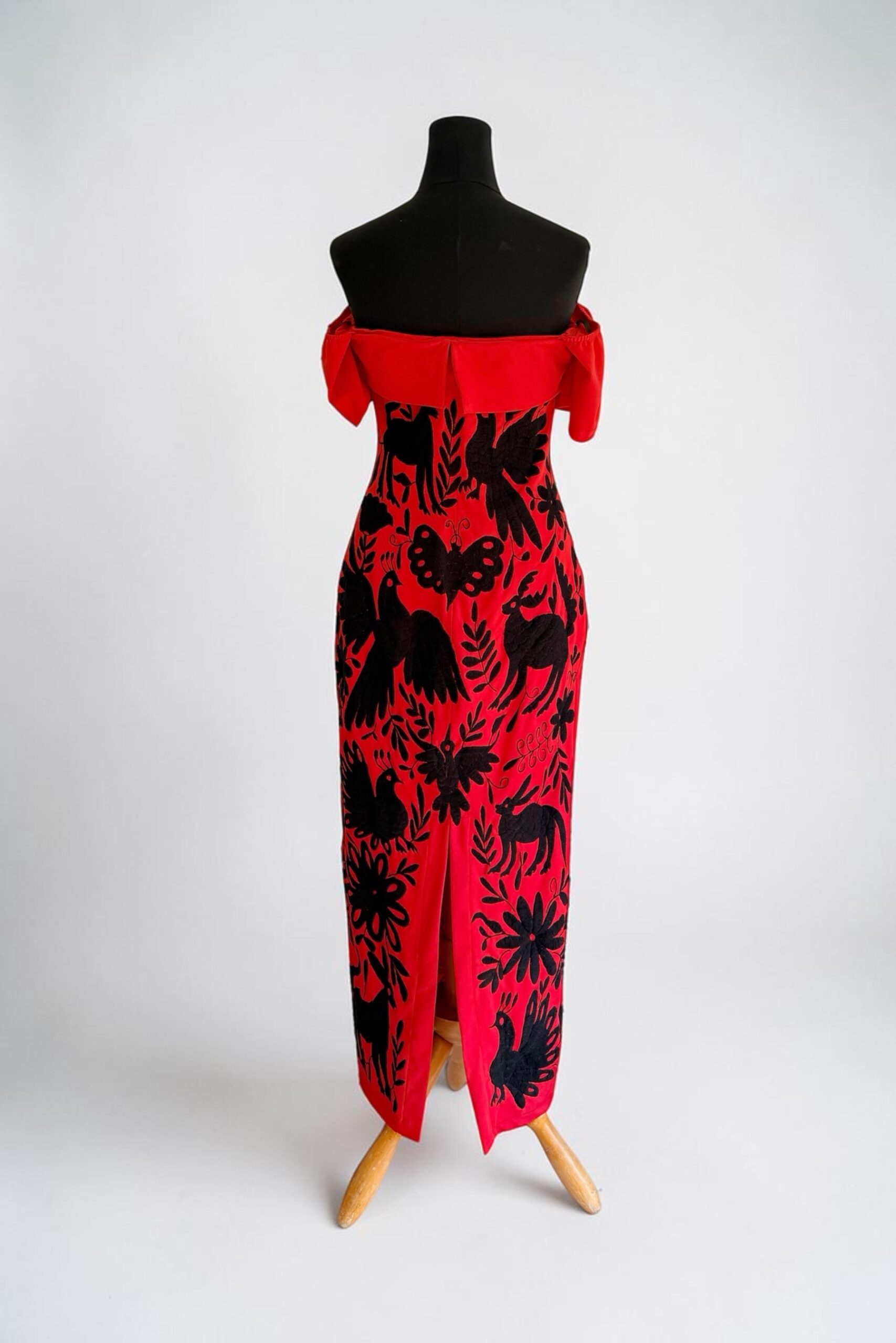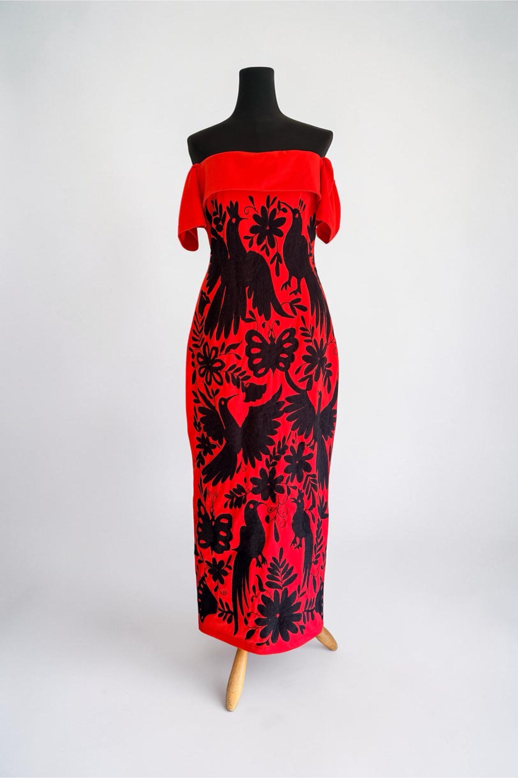 Vestido talla grande, elaborado con tela techno crepé en color rojo que contiene spandex y con bordado tenango en color negro hecho a mano.