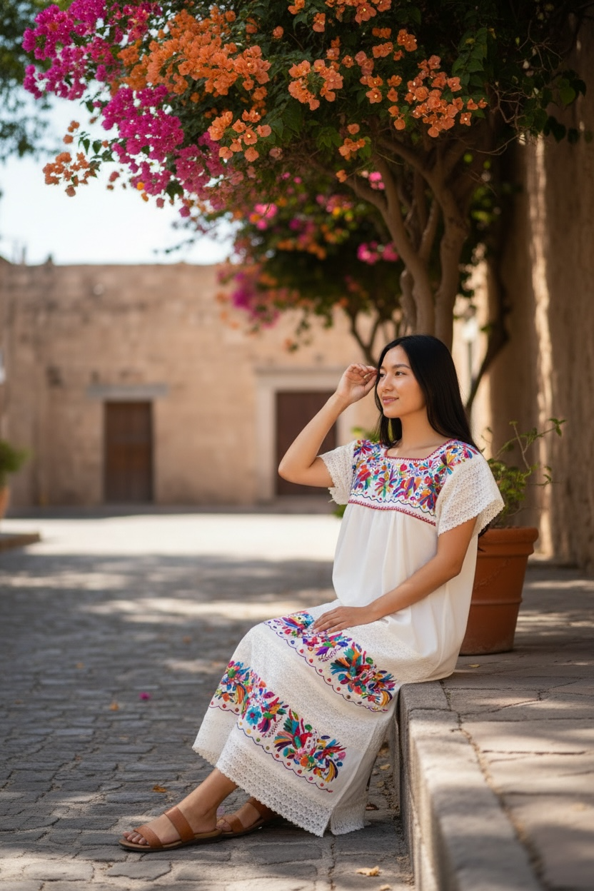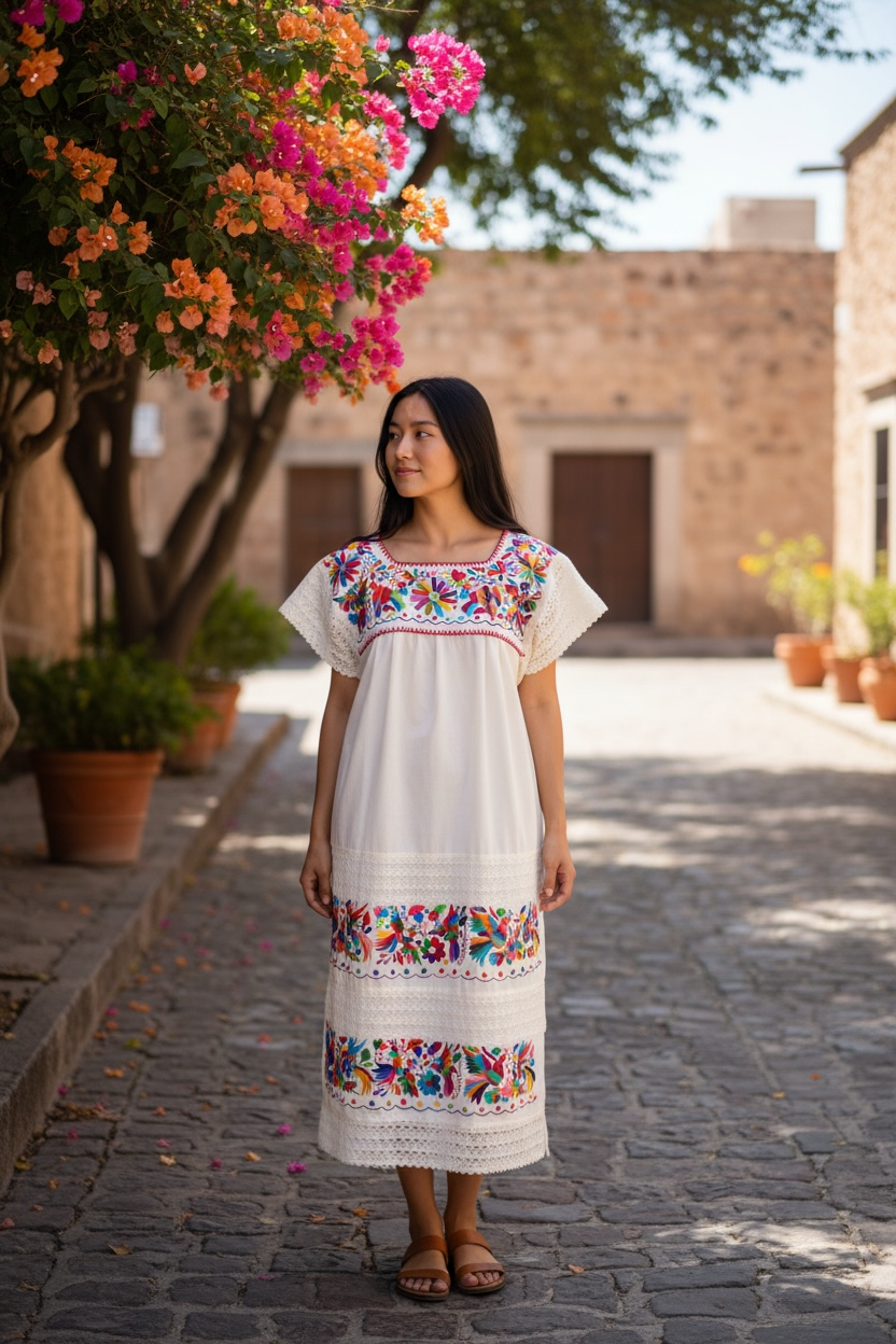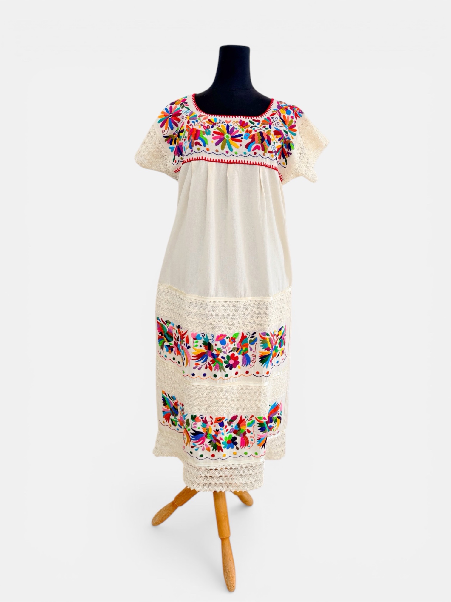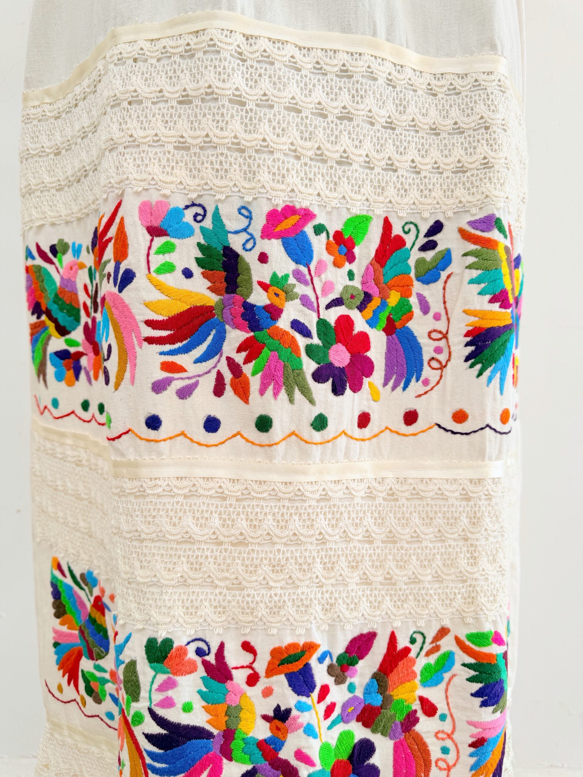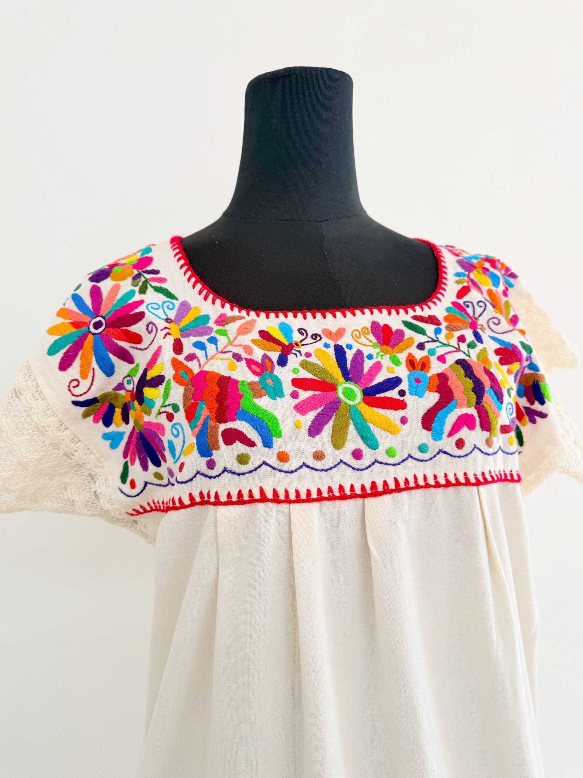 Vestido talla mediano/grande elaborado con manga de algodón color crudo y con bordado tenango multicolor.